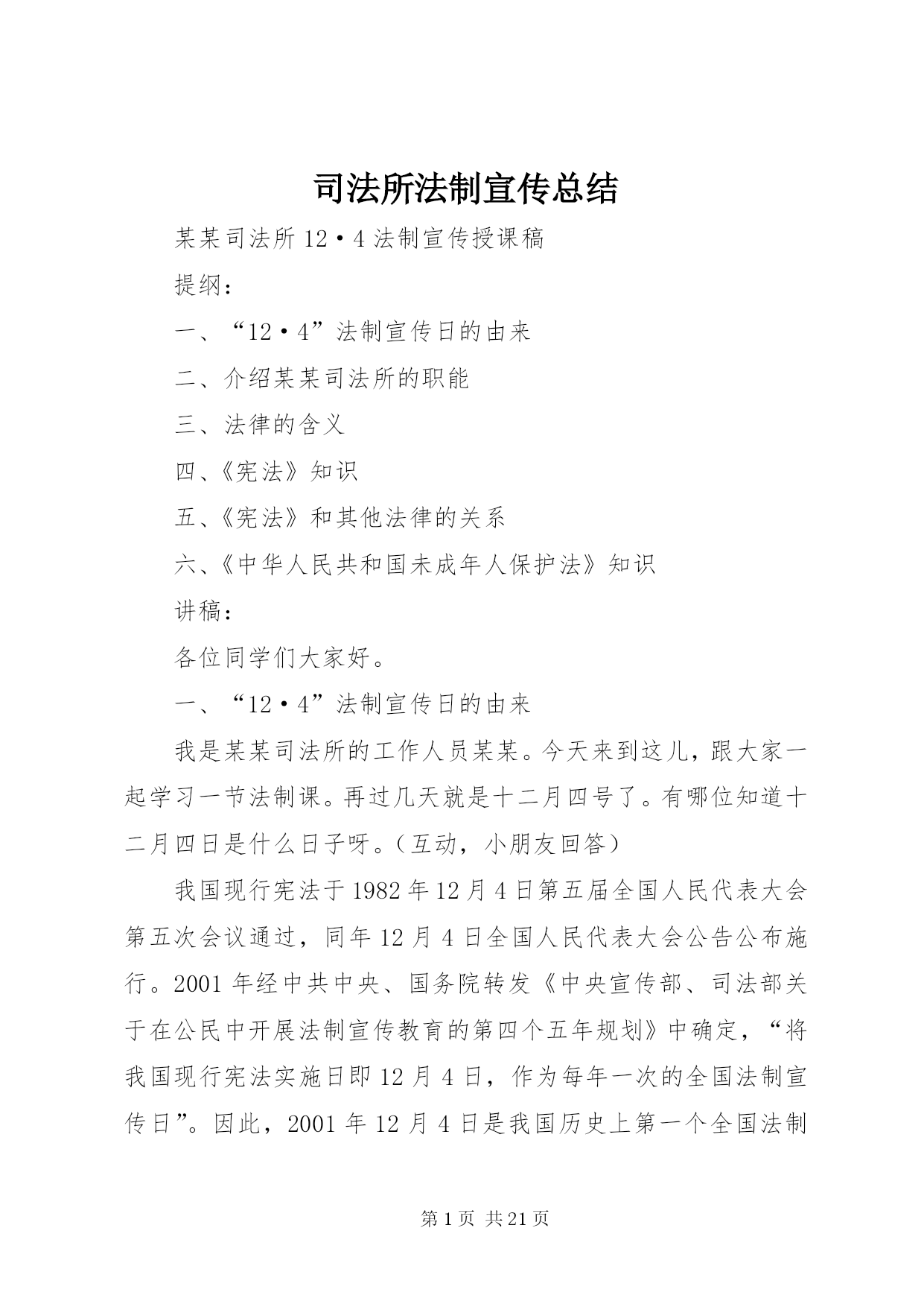 第PAGE\*Arabic\*MERGEFORMAT21页共NUMPAGES\*MERGEFORMAT21页司法所法制宣传总结某某司法所12·4法制宣传授课稿提纲:一、“12·4”法制宣传日的由来二、介绍某某司法所的职能三、法律的含义四、《宪法》知识五、《宪法》和其他法律的关系六、《中华人民共和国未成年人保护法》知识讲稿:各位同学们大家好。一、“12·4”法制宣传日的由来我是某某司法所的工作人员某某。今天来到这儿,跟大家一起学习一节法制课。再过几天就是十二月四号了。有哪位知道十二月四日是什么日