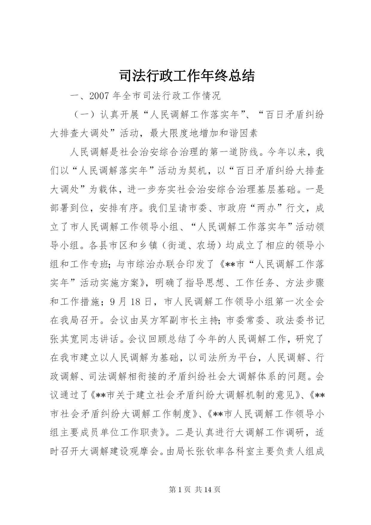 第PAGE\*Arabic\*MERGEFORMAT14页共NUMPAGES\*MERGEFORMAT14页司法行政工作年终总结一、2007年全市司法行政工作情况(一)认真开展“人民调解工作落实年”、“百日矛盾纠纷大排查大调处”活动,最大限度地增加和谐因素人民调解是社会治安综合治理的第一道防线。今年以来,我们以“人民调解落实年”活动为契机,以“百日矛盾纠纷大排查大调处”为载体,进一步夯实社会治安综合治理基层基础。一是部署到位,安排有序。我们呈请市委、市政府“两办”行文,成立了市人民调解工作领导