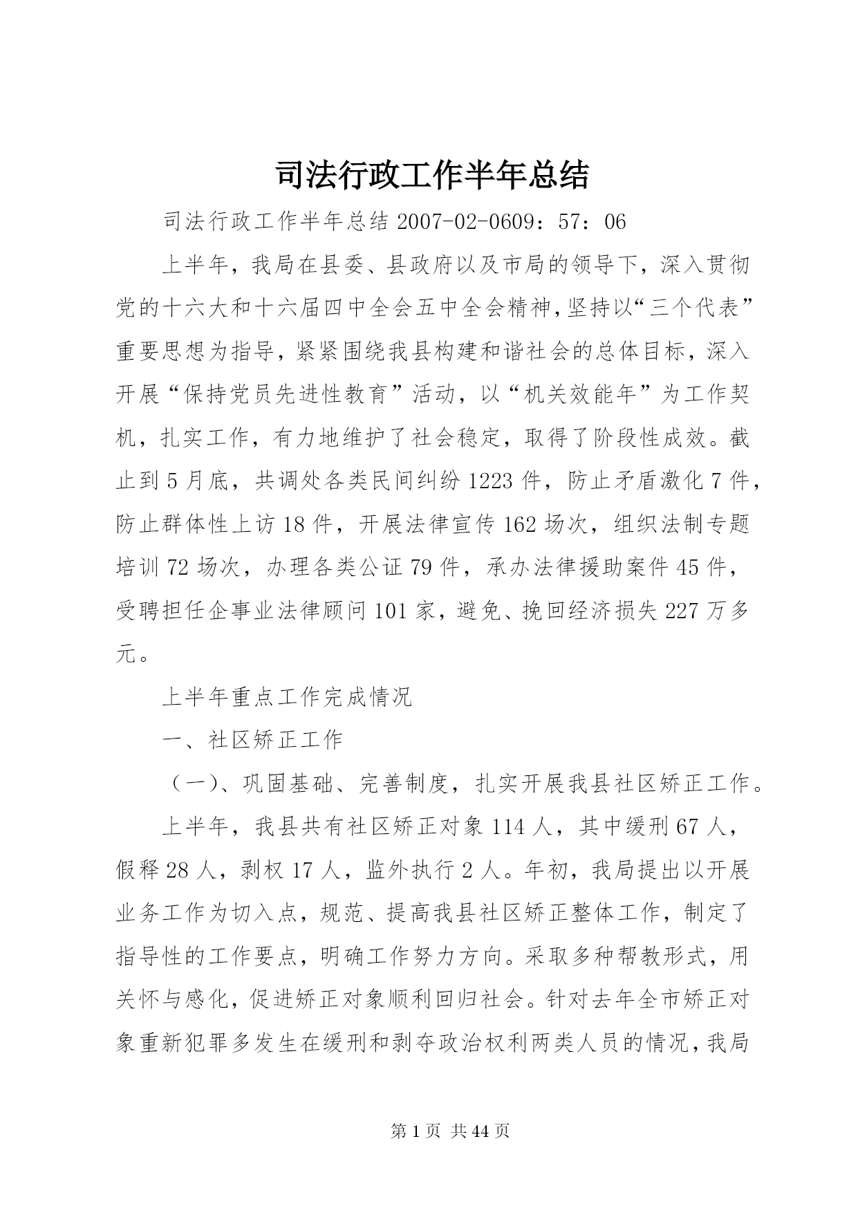 第PAGE\*Arabic\*MERGEFORMAT44页共NUMPAGES\*MERGEFORMAT44页司法行政工作半年总结司法行政工作半年总结2007-02-0609:57:06上半年,我局在县委、县政府以及市局的领导下,深入贯彻党的十六大和十六届四中全会五中全会精神,坚持以“三个代表”重要思想为指导,紧紧围绕我县构建和谐社会的总体目标,深入开展“保持党员先进性教育”活动,以“机关效能年”为工作契机,扎实工作,有力地维护了社会稳定,取得了阶段性成效。截止到5月底,共调处各类民间纠纷122