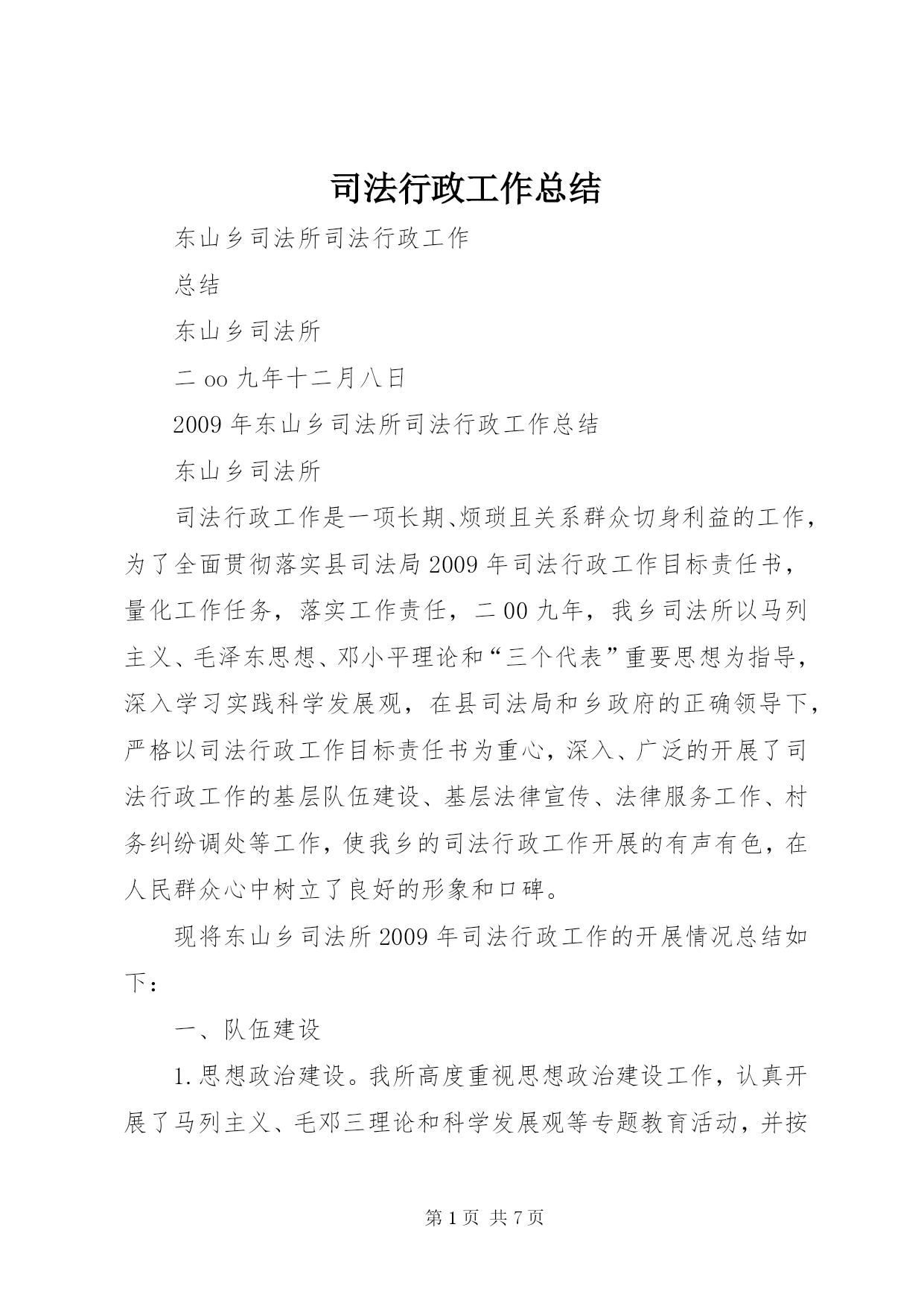 第PAGE\*Arabic\*MERGEFORMAT7页共NUMPAGES\*MERGEFORMAT7页司法行政工作总结东山乡司法所司法行政工作总结东山乡司法所二oo九年十二月八日2009年东山乡司法所司法行政工作总结东山乡司法所司法行政工作是一项长期、烦琐且关系群众切身利益的工作,为了全面贯彻落实县司法局2009年司法行政工作目标责任书,量化工作任务,落实工作责任,二00九年,我乡司法所以马列主义、毛泽东思想、邓小平理论和“三个代表”重要思想为指导,深入学习实践科学发展观,在县司法局和乡政府