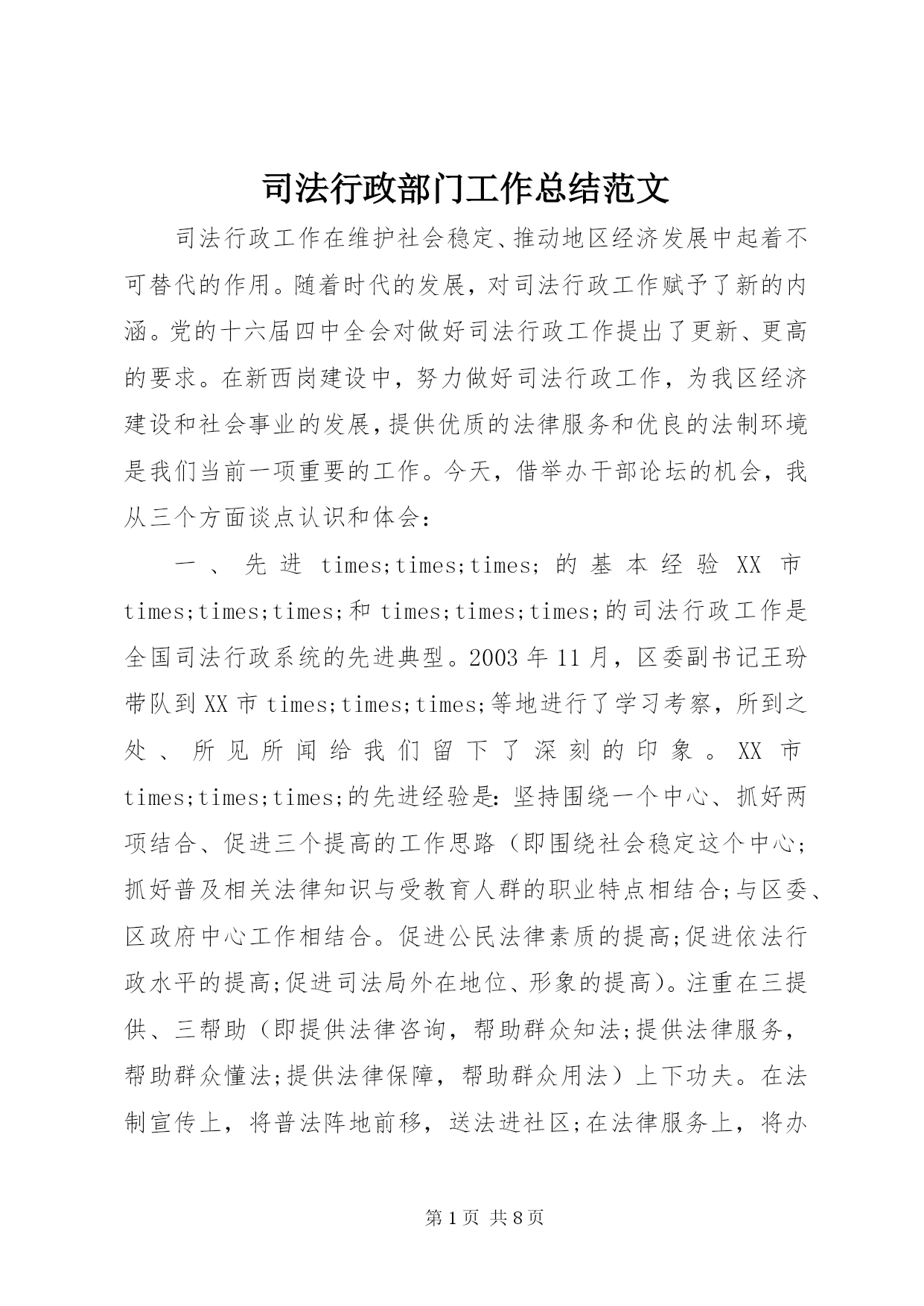 第PAGE\*Arabic\*MERGEFORMAT8页共NUMPAGES\*MERGEFORMAT8页司法行政部门工作总结范文司法行政工作在维护社会稳定、推动地区经济发展中起着不可替代的作用。随着时代的发展,对司法行政工作赋予了新的内涵。党的十六届四中全会对做好司法行政工作提出了更新、更高的要求。在新西岗建设中,努力做好司法行政工作,为我区经济建设和社会事业的发展,提供优质的法律服务和优良的法制环境是我们当前一项重要的工作。今天,借举办干部论坛的机会,我从三个方面谈点认识和体会:一、先进ti