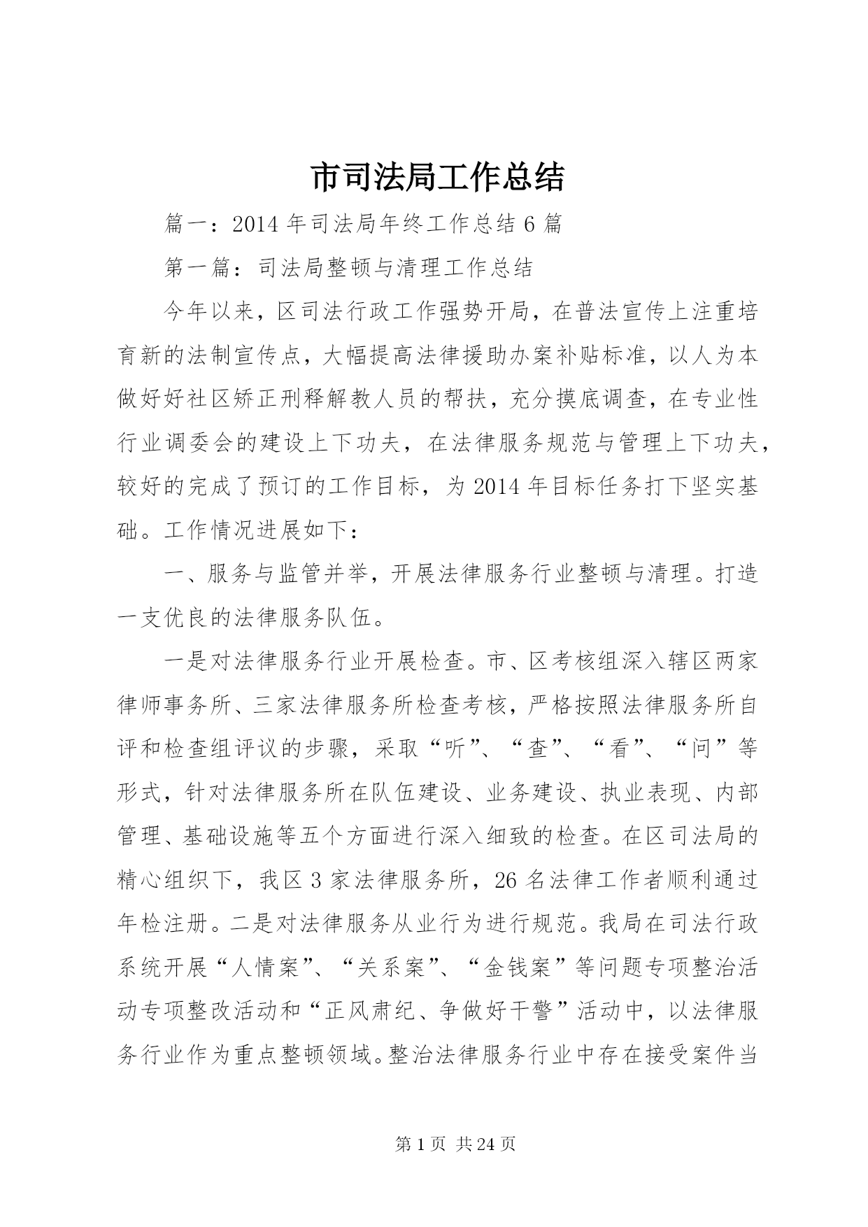 第PAGE\*Arabic\*MERGEFORMAT24页共NUMPAGES\*MERGEFORMAT24页市司法局工作总结篇一:2014年司法局年终工作总结6篇第一篇:司法局整顿与清理工作总结今年以来,区司法行政工作强势开局,在普法宣传上注重培育新的法制宣传点,大幅提高法律援助办案补贴标准,以人为本做好好社区矫正刑释解教人员的帮扶,充分摸底调查,在专业性行业调委会的建设上下功夫,在法律服务规范与管理上下功夫,较好的完成了预订的工作目标,为2014年目标任务打下坚实基础。工作情况进展如下:一、