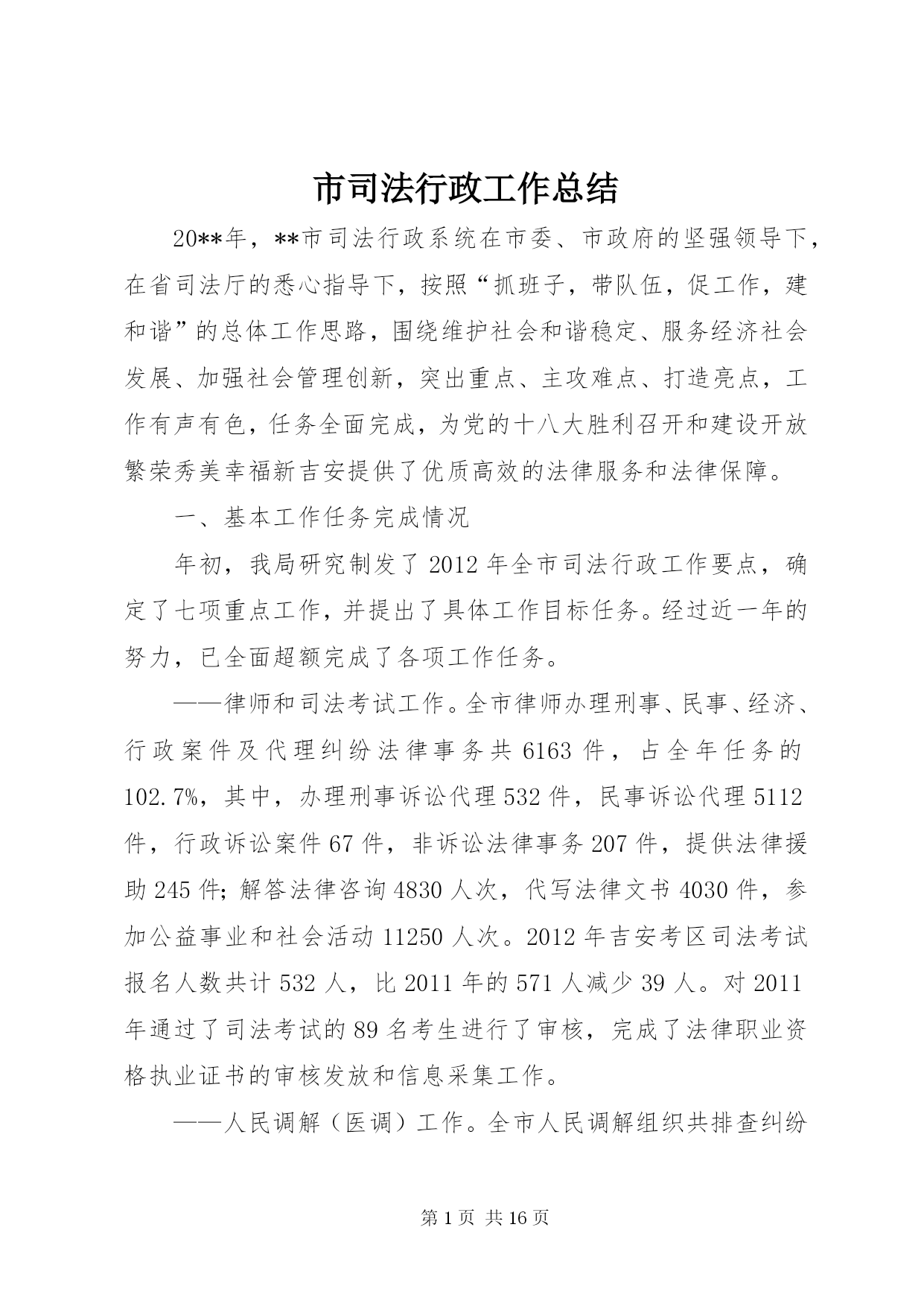 第PAGE\*Arabic\*MERGEFORMAT16页共NUMPAGES\*MERGEFORMAT16页市司法行政工作总结20**年,**市司法行政系统在市委、市政府的坚强领导下,在省司法厅的悉心指导下,按照“抓班子,带队伍,促工作,建和谐”的总体工作思路,围绕维护社会和谐稳定、服务经济社会发展、加强社会管理创新,突出重点、主攻难点、打造亮点,工作有声有色,任务全面完成,为党的十八大胜利召开和建设开放繁荣秀美幸福新吉安提供了优质高效的法律服务和法律保障。一、基本工作任务完成情况年初,我局研