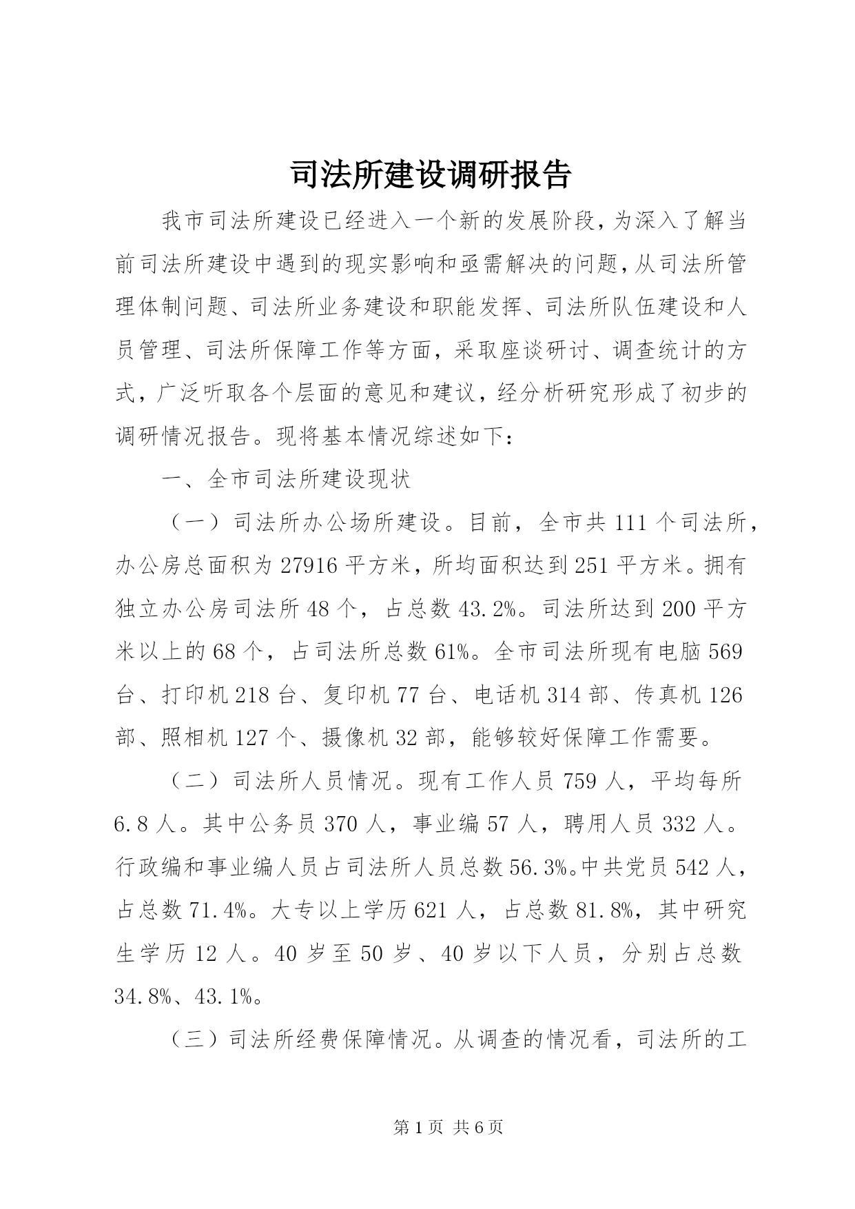 第PAGE\*Arabic\*MERGEFORMAT6页共NUMPAGES\*MERGEFORMAT6页司法所建设调研报告我市司法所建设已经进入一个新的发展阶段,为深入了解当前司法所建设中遇到的现实影响和亟需解决的问题,从司法所管理体制问题、司法所业务建设和职能发挥、司法所队伍建设和人员管理、司法所保障工作等方面,采取座谈研讨、调查统计的方式,广泛听取各个层面的意见和建议,经分析研究形成了初步的调研情况报告。现将基本情况综述如下:一、全市司法所建设现状(一)司法所办公场所建设。目前,全市共11