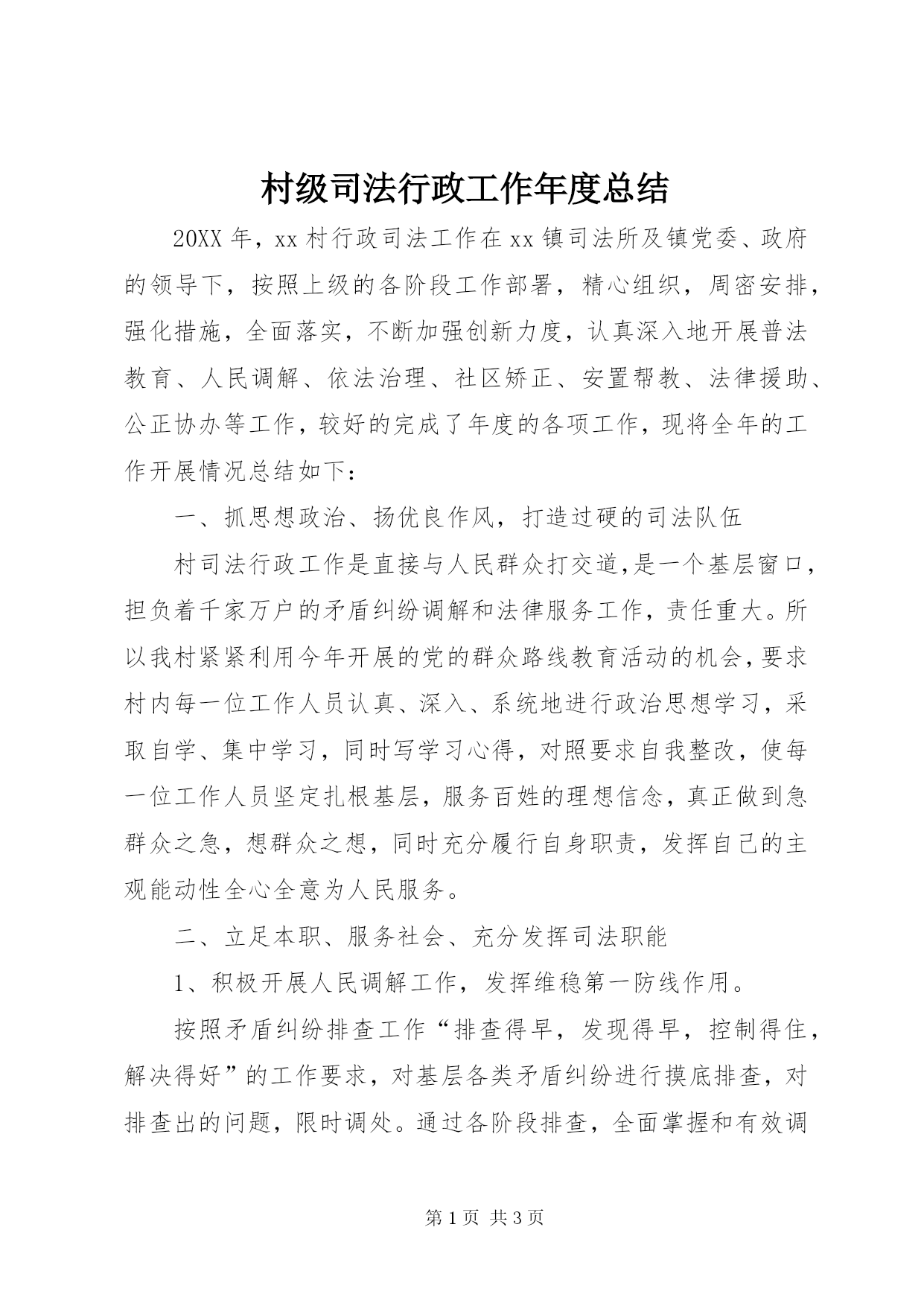 第PAGE\*Arabic\*MERGEFORMAT3页共NUMPAGES\*MERGEFORMAT3页村级司法行政工作年度总结20XX年,xx村行政司法工作在xx镇司法所及镇党委、政府的领导下,按照上级的各阶段工作部署,精心组织,周密安排,强化措施,全面落实,不断加强创新力度,认真深入地开展普法教育、人民调解、依法治理、社区矫正、安置帮教、法律援助、公正协办等工作,较好的完成了年度的各项工作,现将全年的工作开展情况总结如下:一、抓思想政治、扬优良作风,打造过硬的司法队伍村司法行政工作是直接与