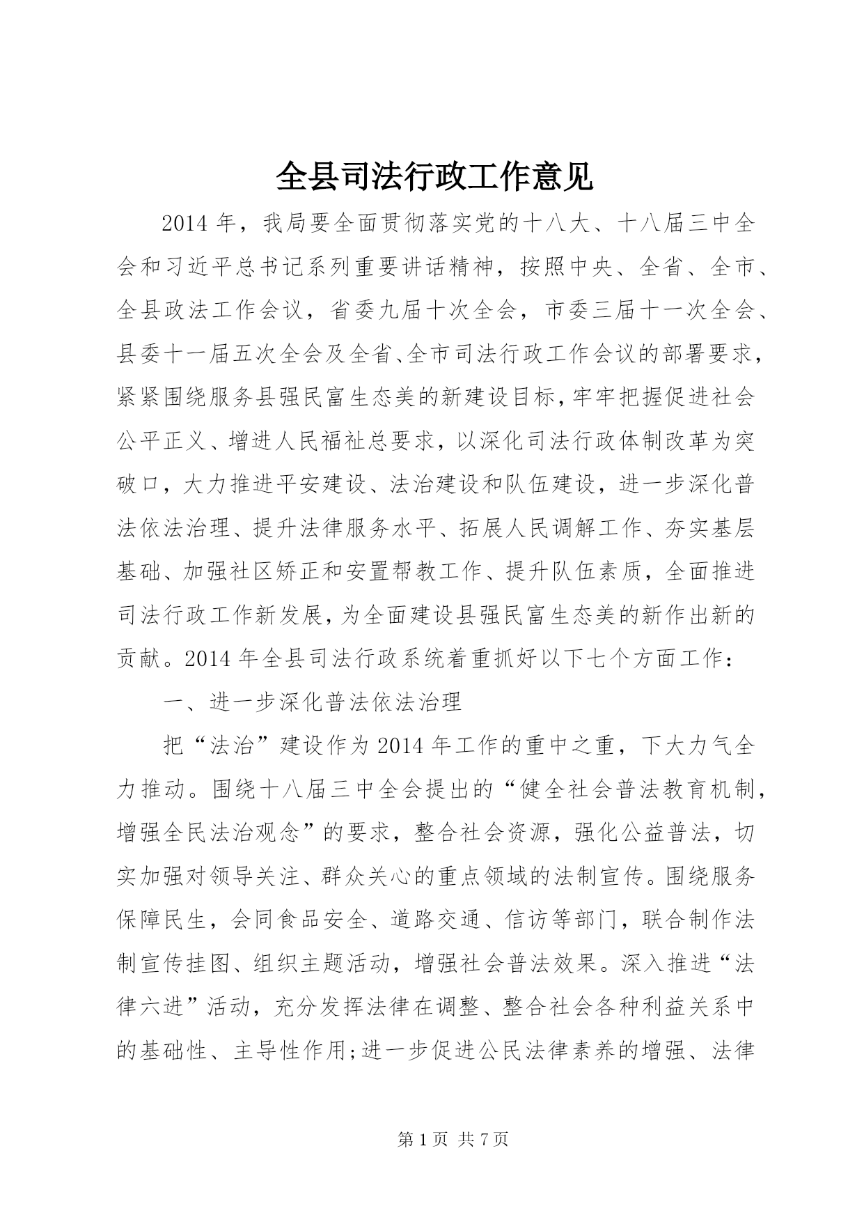 第PAGE\*Arabic\*MERGEFORMAT7页共NUMPAGES\*MERGEFORMAT7页全县司法行政工作意见2014年,我局要全面贯彻落实党的十八大、十八届三中全会和习近平总书记系列重要讲话精神,按照中央、全省、全市、全县政法工作会议,省委九届十次全会,市委三届十一次全会、县委十一届五次全会及全省、全市司法行政工作会议的部署要求,紧紧围绕服务县强民富生态美的新建设目标,牢牢把握促进社会公平正义、增进人民福祉总要求,以深化司法行政体制改革为突破口,大力推进平安建设、法治建设和队伍