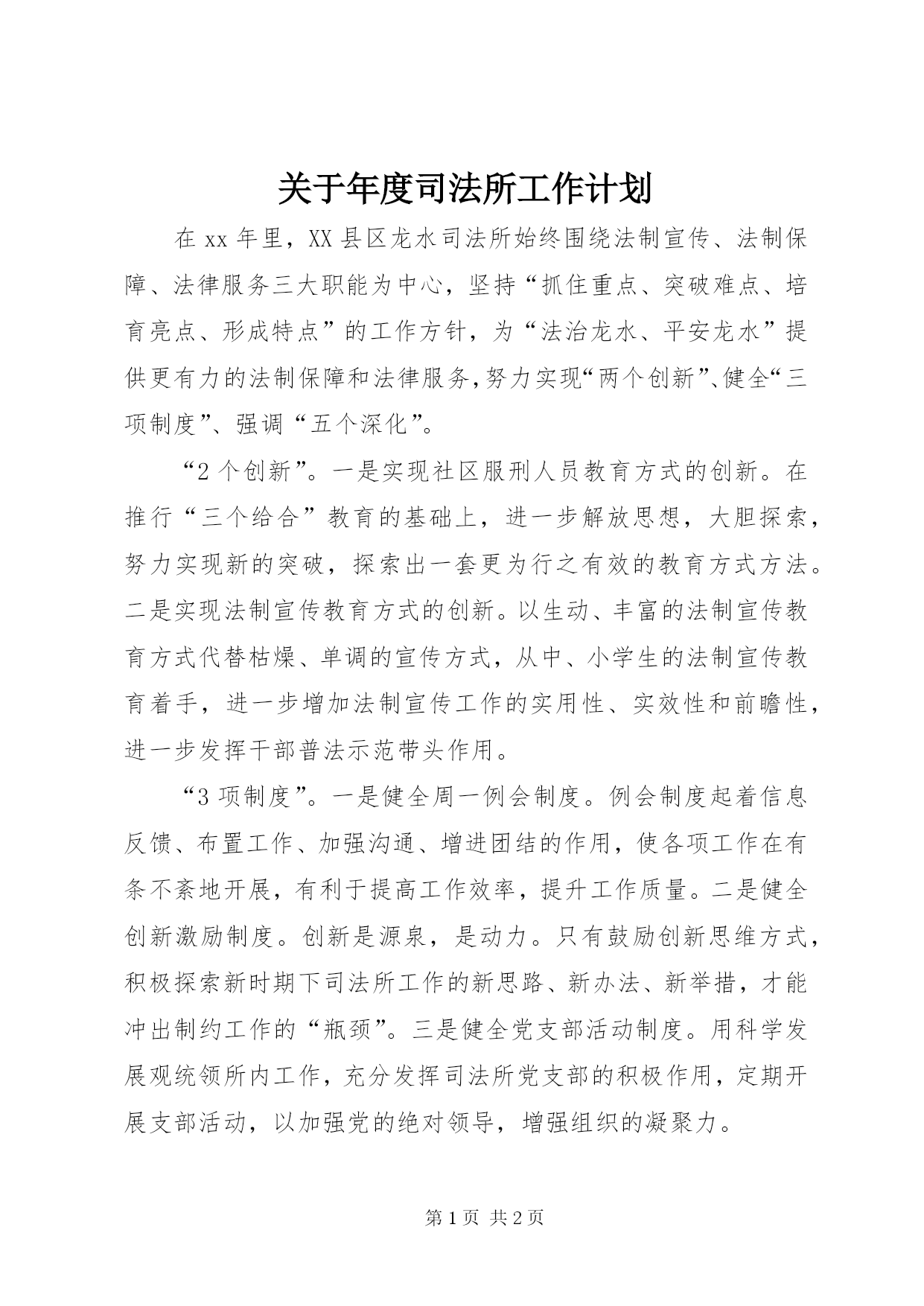 第PAGE\*Arabic\*MERGEFORMAT2页共NUMPAGES\*MERGEFORMAT2页关于年度司法所工作计划在xx年里,XX县区龙水司法所始终围绕法制宣传、法制保障、法律服务三大职能为中心,坚持“抓住重点、突破难点、培育亮点、形成特点”的工作方针,为“法治龙水、平安龙水”提供更有力的法制保障和法律服务,努力实现“两个创新”、健全“三项制度”、强调“五个深化”。“2个创新”。一是实现社区服刑人员教育方式的创新。在推行“三个给合”教育的基础上,进一步解放思想,大胆探索,努力实现新