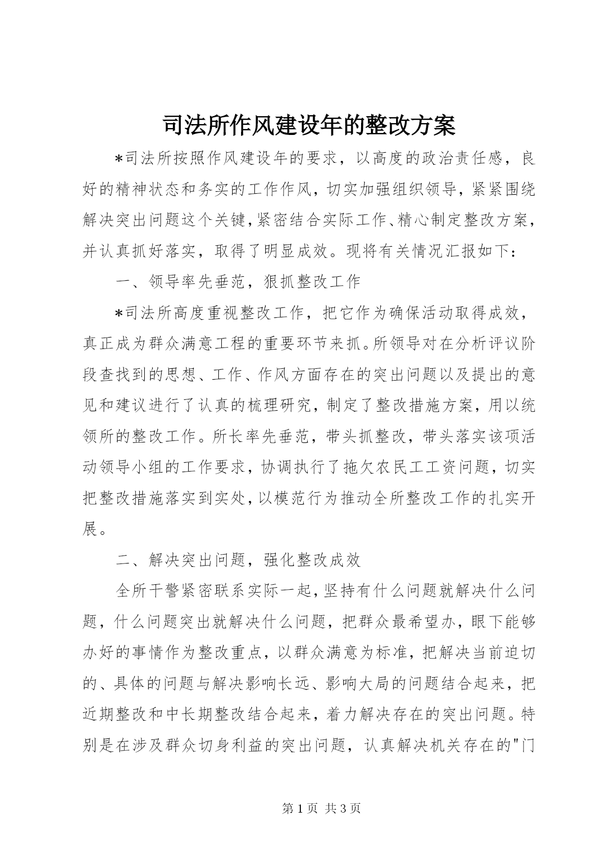 第PAGE\*Arabic\*MERGEFORMAT3页共NUMPAGES\*MERGEFORMAT3页司法所作风建设年的整改方案*司法所按照作风建设年的要求,以高度的政治责任感,良好的精神状态和务实的工作作风,切实加强组织领导,紧紧围绕解决突出问题这个关键,紧密结合实际工作、精心制定整改方案,并认真抓好落实,取得了明显成效。现将有关情况汇报如下:一、领导率先垂范,狠抓整改工作*司法所高度重视整改工作,把它作为确保活动取得成效,真正成为群众满意工程的重要环节来抓。所领导对在分析评议阶段查找到的