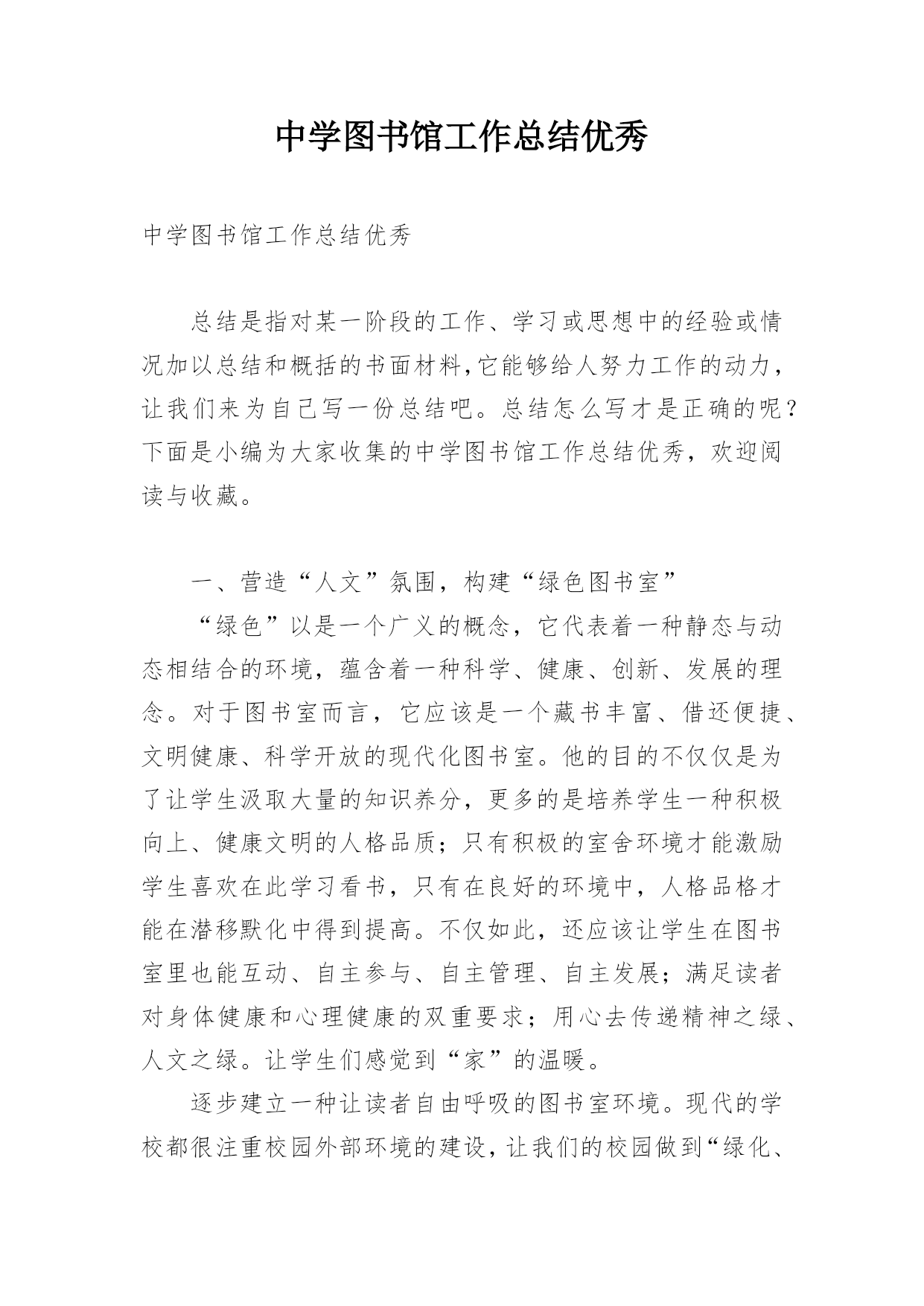 中学图书馆工作总结优秀中学图书馆工作总结优秀总结是指对某一阶段的工作、学习或思想中的经验或情况加以总结和概括的书面材料,它能够给人努力工作的动力,让我们来为自己写一份总结吧。总结怎么写才是正确的呢?下面是小编为大家收集的中学图书馆工作总结优秀,欢迎阅读与收藏。一、营造“人文”氛围,构建“绿色图书室”“绿色”以是一个广义的概念,它代表着一种静态与动态相结合的环境,蕴含着一种科学、健康、创新、发展的理念。对于图书室而言,它应该是一个藏书丰富、借还便捷、文明健康、科学开放的现代化图书室。他的目的不仅仅是为了让学