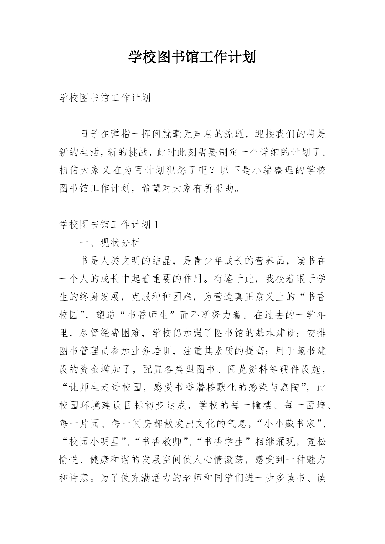 学校图书馆工作计划学校图书馆工作计划日子在弹指一挥间就毫无声息的流逝,迎接我们的将是新的生活,新的挑战,此时此刻需要制定一个详细的计划了。相信大家又在为写计划犯愁了吧?以下是小编整理的学校图书馆工作计划,希望对大家有所帮助。学校图书馆工作计划1一、现状分析书是人类文明的结晶,是青少年成长的营养品,读书在一个人的成长中起着重要的作用。有鉴于此,我校着眼于学生的终身发展,克服种种困难,为营造真正意义上的“书香校园”,塑造“书香师生”而不断努力着。在过去的一学年里,尽管经费困难,学校仍加强了图书馆的基本建设:安