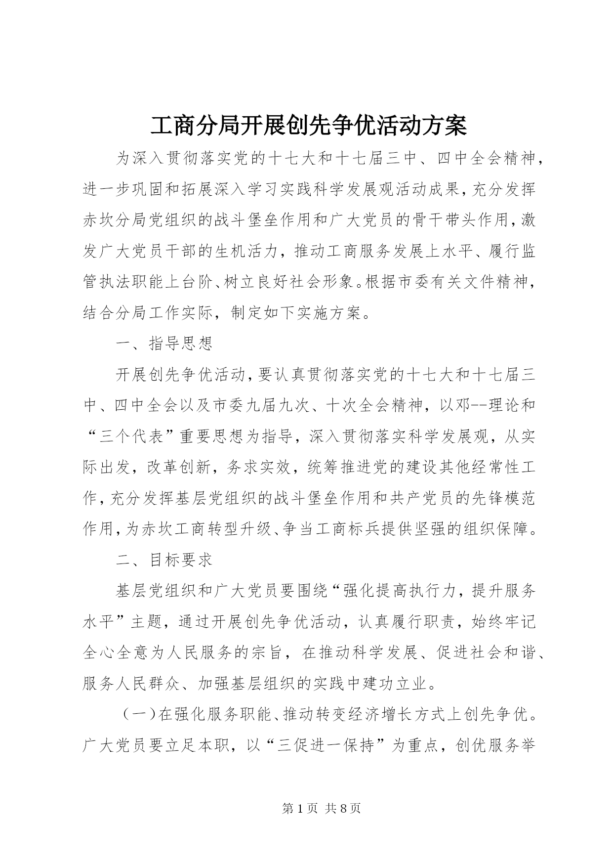 第PAGE\*Arabic\*MERGEFORMAT8页共NUMPAGES\*MERGEFORMAT8页工商分局开展创先争优活动方案为深入贯彻落实党的十七大和十七届三中、四中全会精神,进一步巩固和拓展深入学习实践科学发展观活动成果,充分发挥赤坎分局党组织的战斗堡垒作用和广大党员的骨干带头作用,激发广大党员干部的生机活力,推动工商服务发展上水平、履行监管执法职能上台阶、树立良好社会形象。根据市委有关文件精神,结合分局工作实际,制定如下实施方案。一、指导思想开展创先争优活动,要认真贯彻落实党的十七