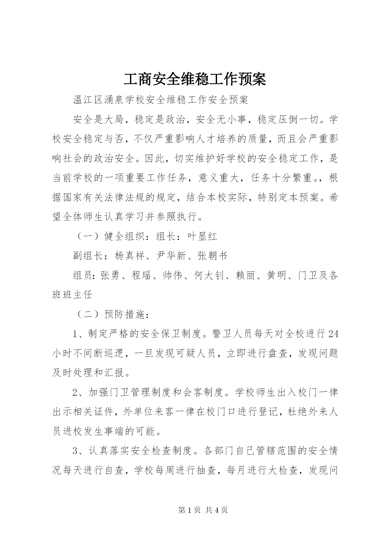 第PAGE\*Arabic\*MERGEFORMAT4页共NUMPAGES\*MERGEFORMAT4页工商安全维稳工作预案温江区涌泉学校安全维稳工作安全预案安全是大局,稳定是政治,安全无小事,稳定压倒一切。学校安全稳定与否,不仅严重影响人才培养的质量,而且会严重影响社会的政治安全。因此,切实维护好学校的安全稳定工作,是当前学校的一项重要工作任务,意义重大,任务十分繁重。,根据国家有关法律法规的规定,结合本校实际,特别定本预案。希望全体师生认真学习并参照执行。(一)健全组织:组长:叶显红副组长