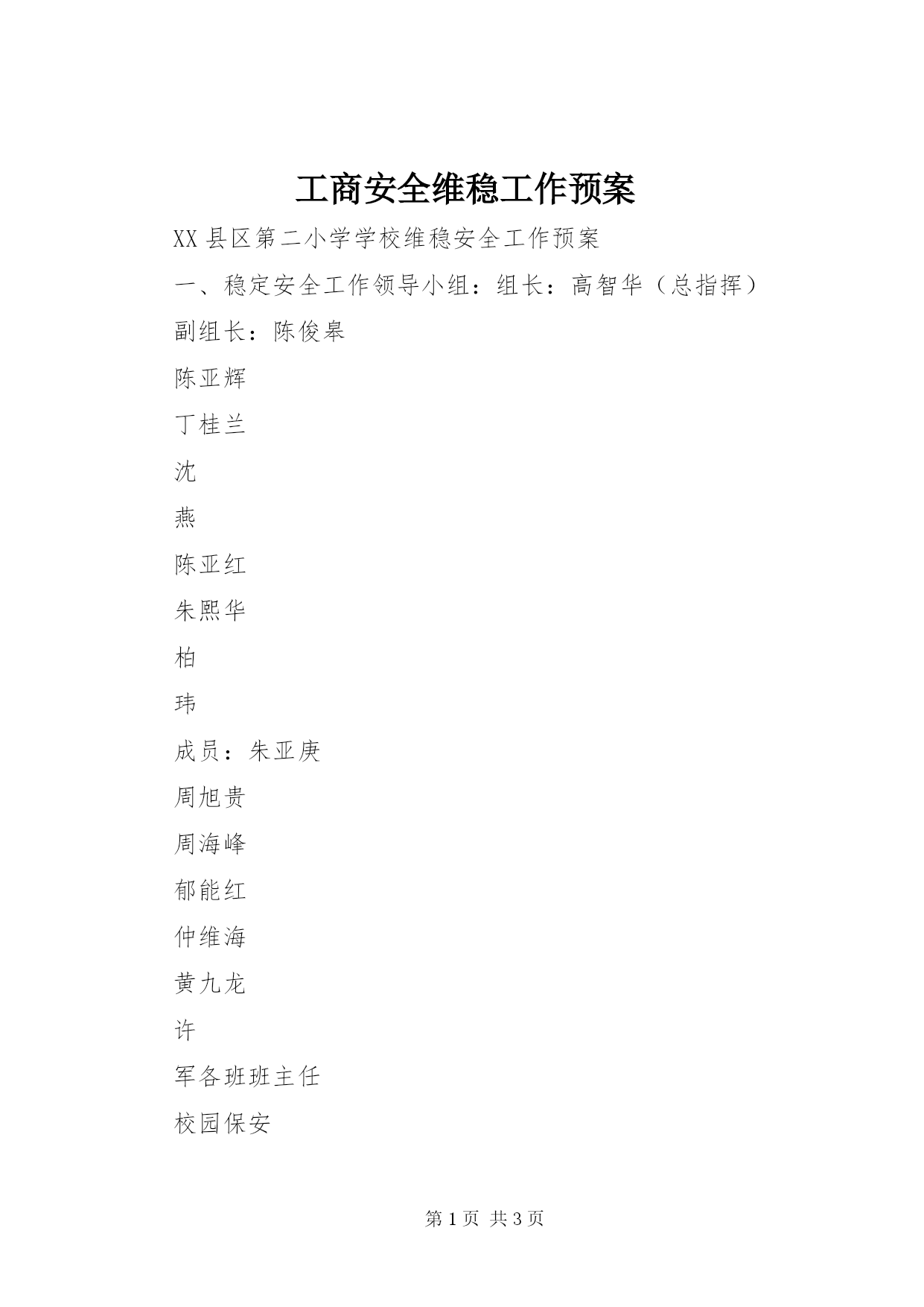 第PAGE\*Arabic\*MERGEFORMAT3页共NUMPAGES\*MERGEFORMAT3页工商安全维稳工作预案XX县区第二小学学校维稳安全工作预案一、稳定安全工作领导小组:组长:高智华(总指挥)副组长:陈俊皋陈亚辉丁桂兰沈燕陈亚红朱熙华柏玮成员:朱亚庚周旭贵周海峰郁能红仲维海黄九龙许军各班班主任校园保安二、具体职责领导小组职责:(1)全面负责学校稳定安全工作的组织协调;(2)全面负责学校定安全工作经费的筹措;(3)全面负责学校稳定安全工作的督察。三、具体措施(一)切实做好预防工作