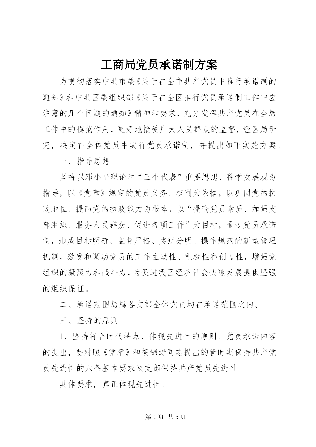 第PAGE\*Arabic\*MERGEFORMAT5页共NUMPAGES\*MERGEFORMAT5页工商局党员承诺制方案为贯彻落实中共市委《关于在全市共产党员中推行承诺制的通知》和中共区委组织部《关于在全区推行党员承诺制工作中应注意的几个问题的通知》精神和要求,充分发挥共产党员在全局工作中的模范作用,更好地接受广大人民群众的监督,经区局研究,决定在全体党员中实行党员承诺制,并提出如下实施方案。一、指导思想坚持以邓小平理论和“三个代表”重要思想、科学发展观为指导,以《党章》规定的党员义务、权