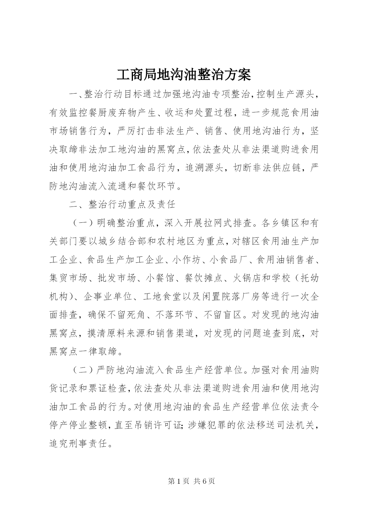 第PAGE\*Arabic\*MERGEFORMAT6页共NUMPAGES\*MERGEFORMAT6页工商局地沟油整治方案一、整治行动目标通过加强地沟油专项整治,控制生产源头,有效监控餐厨废弃物产生、收运和处置过程,进一步规范食用油市场销售行为,严厉打击非法生产、销售、使用地沟油行为,坚决取缔非法加工地沟油的黑窝点,依法查处从非法渠道购进食用油和使用地沟油加工食品行为,追溯源头,切断非法供应链,严防地沟油流入流通和餐饮环节。二、整治行动重点及责任(一)明确整治重点,深入开展拉网式排查。各乡镇