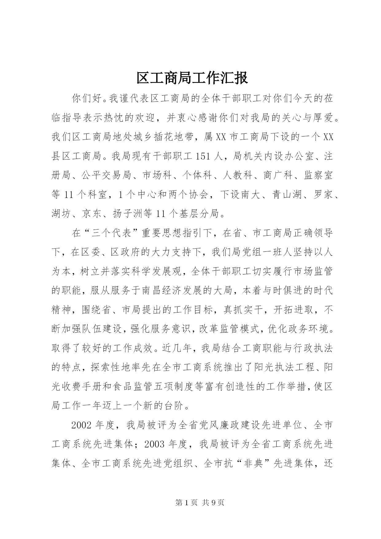 第PAGE\*Arabic\*MERGEFORMAT9页共NUMPAGES\*MERGEFORMAT9页区工商局工作汇报你们好。我谨代表区工商局的全体干部职工对你们今天的莅临指导表示热忱的欢迎,并衷心感谢你们对我局的关心与厚爱。我们区工商局地处城乡插花地带,属XX市工商局下设的一个XX县区工商局。我局现有干部职工151人,局机关内设办公室、注册局、公平交易局、市场科、个体科、人教科、商广科、监察室等11个科室,1个中心和两个协会,下设南大、青山湖、罗家、湖坊、京东、扬子洲等11个基层分局。在“