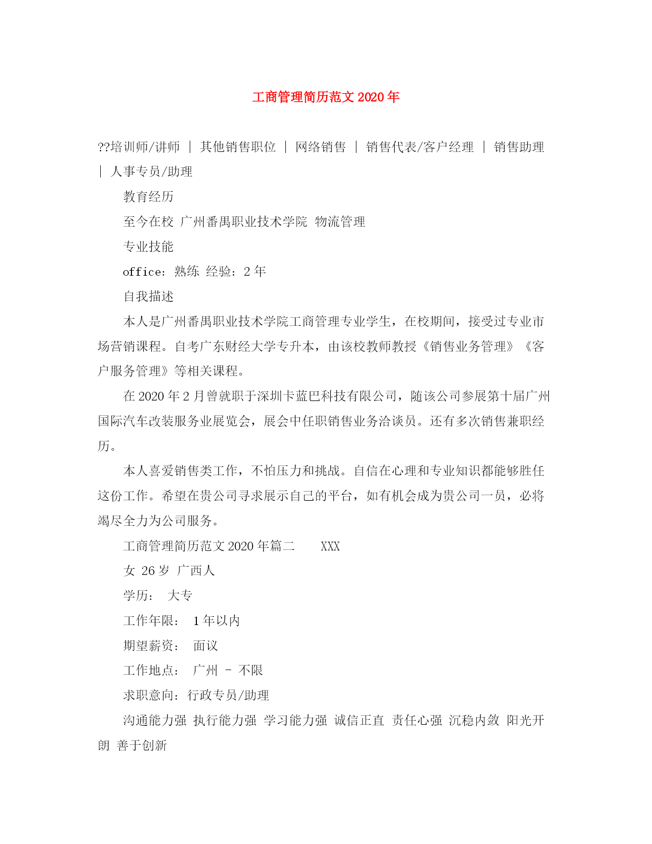 此资料由网络收集而来,如有侵权请告知上传者立即删除。资料共分享,我们负责传递知识。工商管理简历范文2020年??培训师/讲师|其他销售职位|网络销售|销售代表/客户经理|销售助理|人事专员/助理教育经历至今在校广州番禺职业技术学院物流管理专业技能office:熟练经验:2年自我描述本人是广州番禺职业技术学院工商管理专业学生,在校期间,接受过专业市场营销课程。自考广东财经大学专升本,由该校教师教授《销售业务管理》《客户服务管理》等相关课程。在2020年2月曾就职于深圳卡蓝巴科技有限公司,随该公司参展第十届广