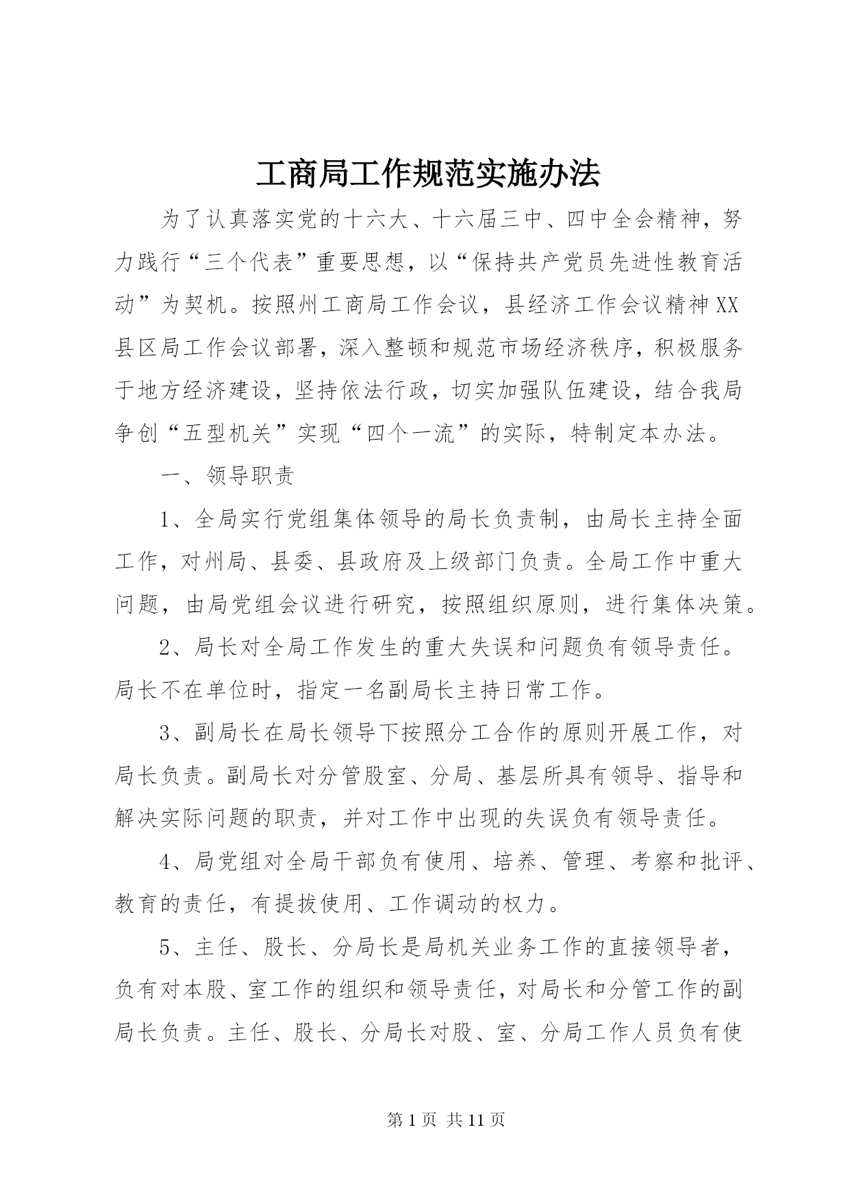第PAGE\*Arabic\*MERGEFORMAT11页共NUMPAGES\*MERGEFORMAT11页工商局工作规范实施办法为了认真落实党的十六大、十六届三中、四中全会精神,努力践行“三个代表”重要思想,以“保持共产党员先进性教育活动”为契机。按照州工商局工作会议,县经济工作会议精神XX县区局工作会议部署,深入整顿和规范市场经济秩序,积极服务于地方经济建设,坚持依法行政,切实加强队伍建设,结合我局争创“五型机关”实现“四个一流”的实际,特制定本办法。一、领导职责1、全局实行党组集体领导的