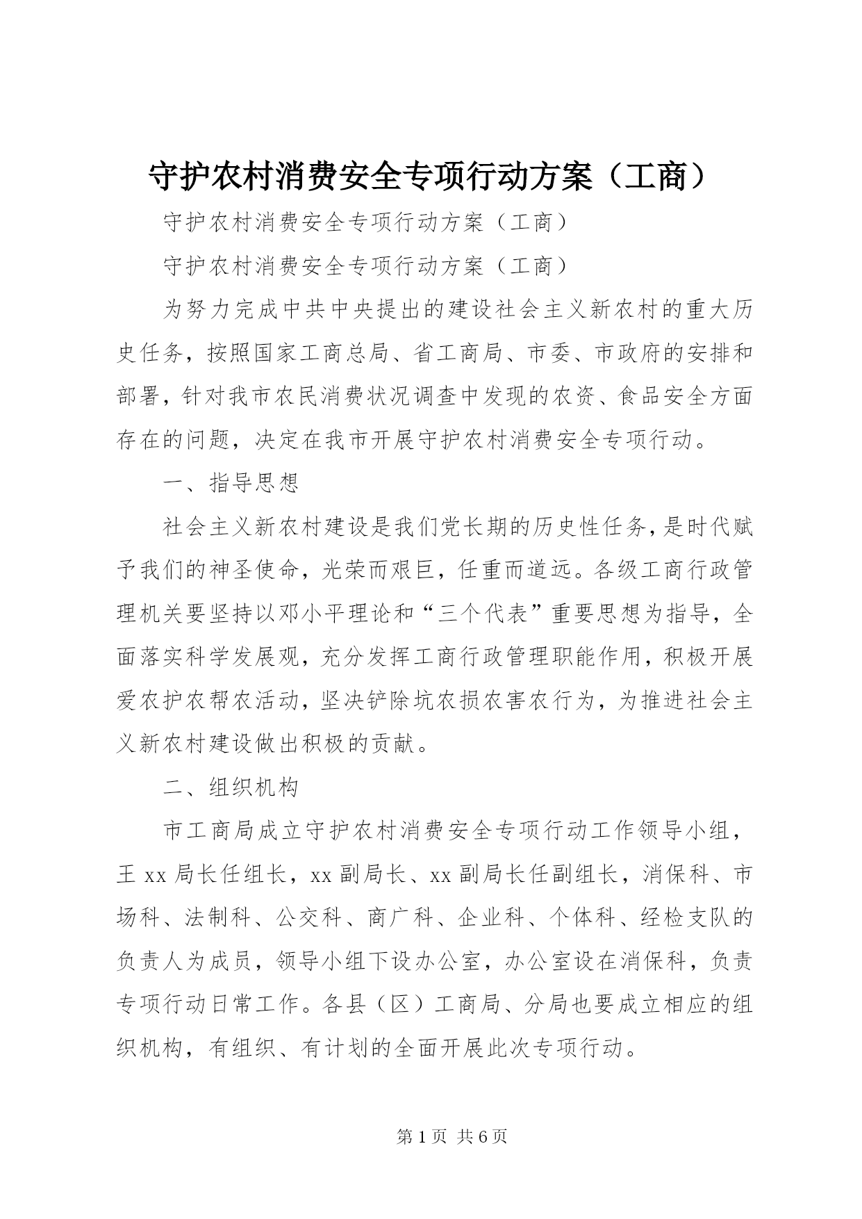 第PAGE\*Arabic\*MERGEFORMAT6页共NUMPAGES\*MERGEFORMAT6页守护农村消费安全专项行动方案(工商)守护农村消费安全专项行动方案(工商)守护农村消费安全专项行动方案(工商)为努力完成中共中央提出的建设社会主义新农村的重大历史任务,按照国家工商总局、省工商局、市委、市政府的安排和部署,针对我市农民消费状况调查中发现的农资、食品安全方面存在的问题,决定在我市开展守护农村消费安全专项行动。一、指导思想社会主义新农村建设是我们党长期的历史性任务,是时代赋予我们的