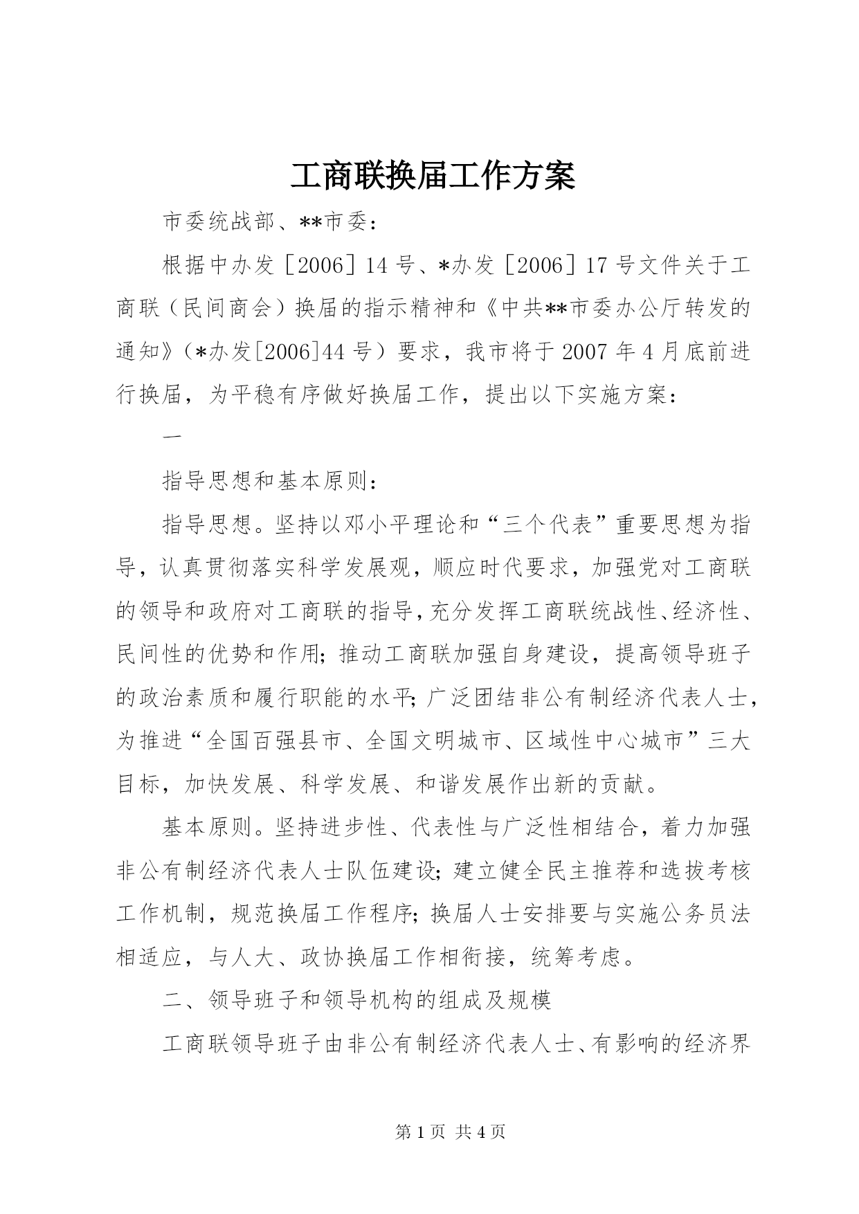 第PAGE\*Arabic\*MERGEFORMAT4页共NUMPAGES\*MERGEFORMAT4页工商联换届工作方案市委统战部、**市委:根据中办发[2006]14号、*办发[2006]17号文件关于工商联(民间商会)换届的指示精神和《中共**市委办公厅转发的通知》(*办发[2006]44号)要求,我市将于2007年4月底前进行换届,为平稳有序做好换届工作,提出以下实施方案:一指导思想和基本原则:指导思想。坚持以邓小平理论和“三个代表”重要思想为指导,认真贯彻落实科学发展观,顺应时代要求
