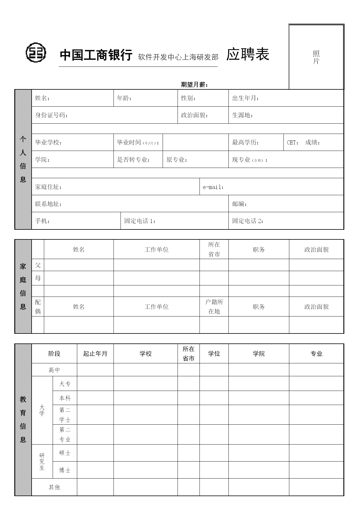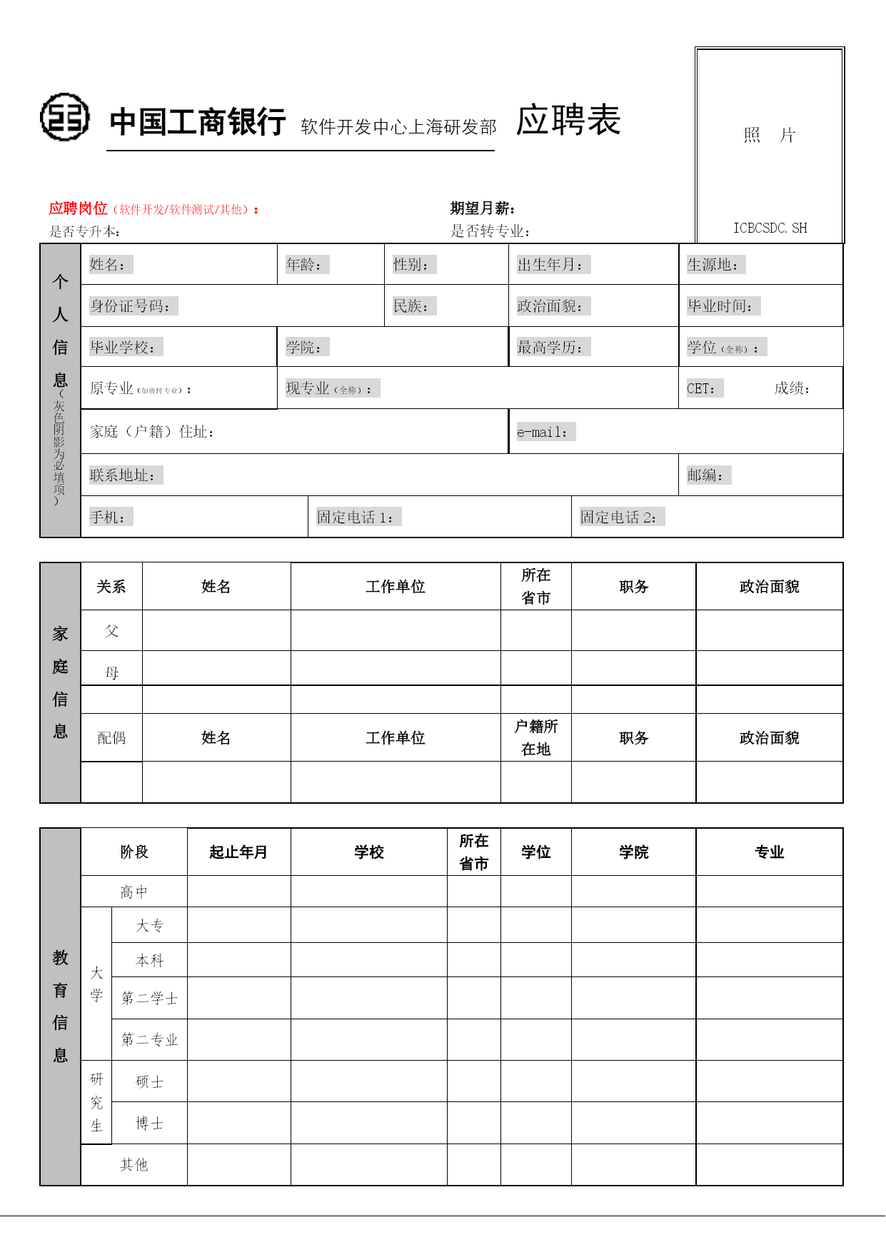 中国工商银行软件开发中心上海研发部应聘表照片ICBCSDC.SH应聘岗位(软件开发/软件测试/其他):期望月薪:是否专升本:是否转专业:个人信息(灰色阴影为必填项)姓名:年龄:性别:出生年月:生源地:身份证号码:民族:政治面貌:毕业时间:毕业学校:学院:最高学历:学位(全称):原专业(如曾转专业):现专业(全称):CET:成绩:家庭(户籍)住址:e-mail:联系地址:邮编:手机:固定电话1:固定电话2:家庭信息关系姓名工作单位所在省市职务政治面貌父母配偶姓名工作单位户籍所在地职务政治面貌教育信息阶段起止