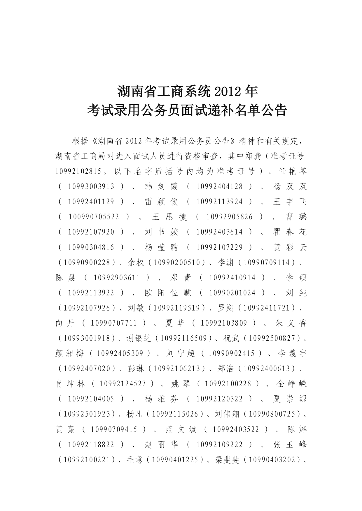 湖南省工商系统2012年考试录用公务员面试递补名单公告根据《湖南省2012年考试录用公务员公告》精神和有关规定,湖南省工商局对进入面试人员进行资格审查,其中郑龚(准考证号10992102815,以下名字后括号内均为准考证号)、任艳芩(10993003913)、韩剑霞(10992404128)、杨双双(10992401129)、雷颖俊(10992113924)、王宇飞(100990705522)、王思捷(10992905826)、曹璐(10992107920)、刘书姣(10992403614)、瞿春花(10