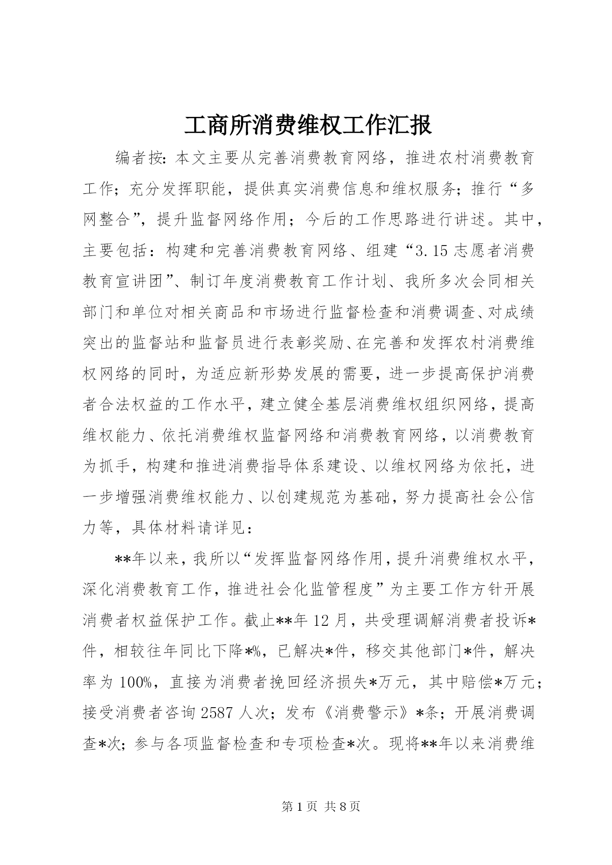 第PAGE\*Arabic\*MERGEFORMAT8页共NUMPAGES\*MERGEFORMAT8页工商所消费维权工作汇报编者按:本文主要从完善消费教育网络,推进农村消费教育工作;充分发挥职能,提供真实消费信息和维权服务;推行“多网整合”,提升监督网络作用;今后的工作思路进行讲述。其中,主要包括:构建和完善消费教育网络、组建“3.15志愿者消费教育宣讲团”、制订年度消费教育工作计划、我所多次会同相关部门和单位对相关商品和市场进行监督检查和消费调查、对成绩突出的监督站和监督员进行表彰奖励、在