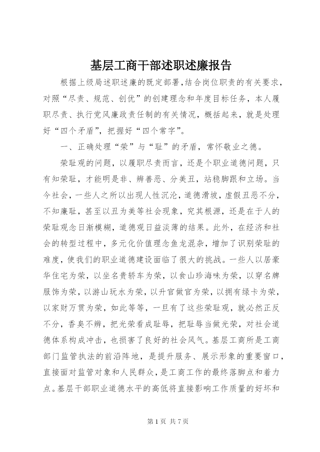 第PAGE\*Arabic\*MERGEFORMAT7页共NUMPAGES\*MERGEFORMAT7页基层工商干部述职述廉报告根据上级局述职述廉的既定部署,结合岗位职责的有关要求,对照“尽责、规范、创优”的创建理念和年度目标任务,本人履职尽责、执行党风廉政责任制的有关情况,概括起来,就是处理好“四个矛盾”,把握好“四个常字”。一、正确处理“荣”与“耻”的矛盾,常怀敬业之德。荣耻观的问题,以履职尽责而言,还是个职业道德问题,只有知荣耻,才能明是非、辨善恶、分美丑,站稳脚跟和立场。当今社会,一些