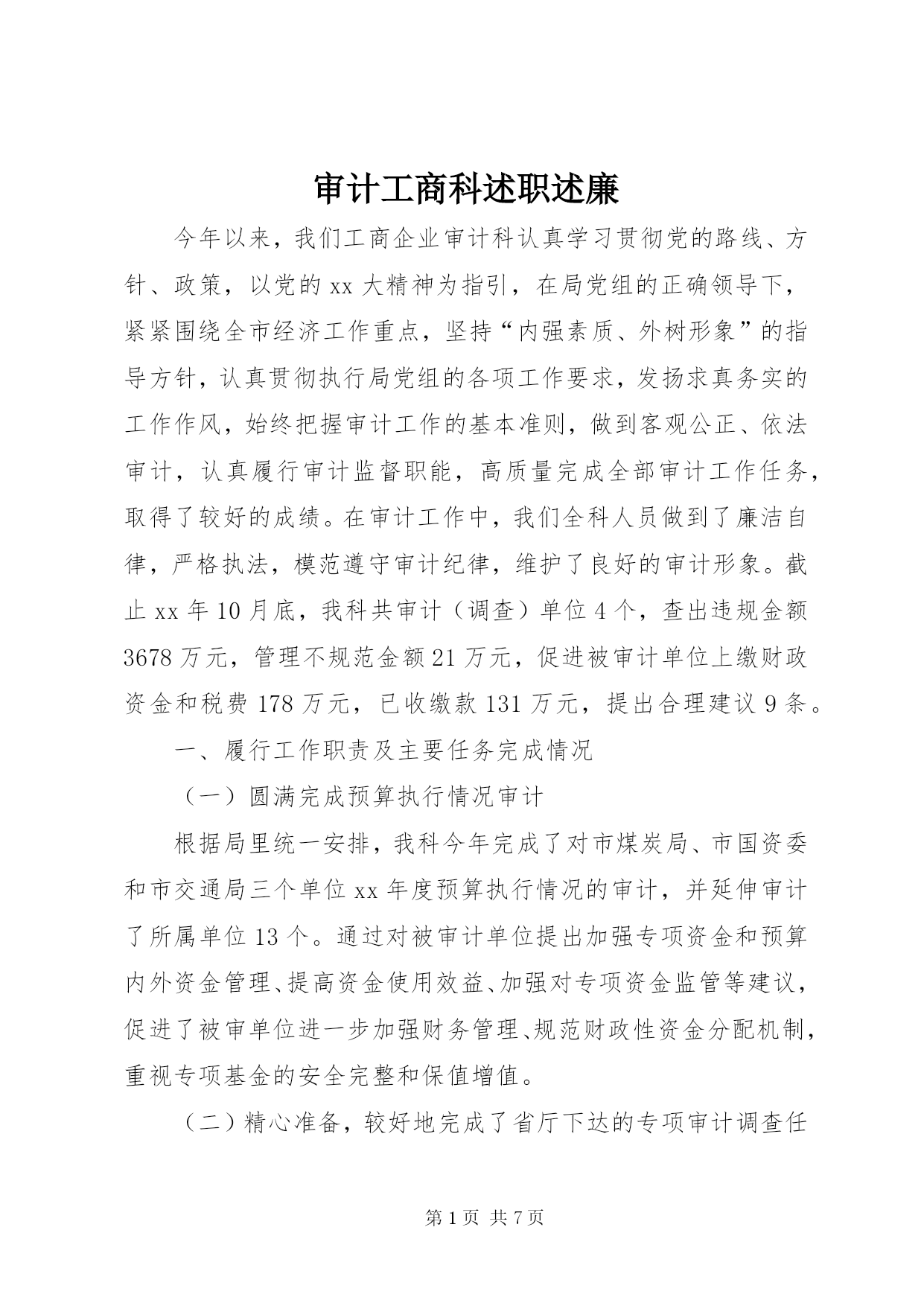 第PAGE\*Arabic\*MERGEFORMAT7页共NUMPAGES\*MERGEFORMAT7页审计工商科述职述廉今年以来,我们工商企业审计科认真学习贯彻党的路线、方针、政策,以党的xx大精神为指引,在局党组的正确领导下,紧紧围绕全市经济工作重点,坚持“内强素质、外树形象”的指导方针,认真贯彻执行局党组的各项工作要求,发扬求真务实的工作作风,始终把握审计工作的基本准则,做到客观公正、依法审计,认真履行审计监督职能,高质量完成全部审计工作任务,取得了较好的成绩。在审计工作中,我们全科人员
