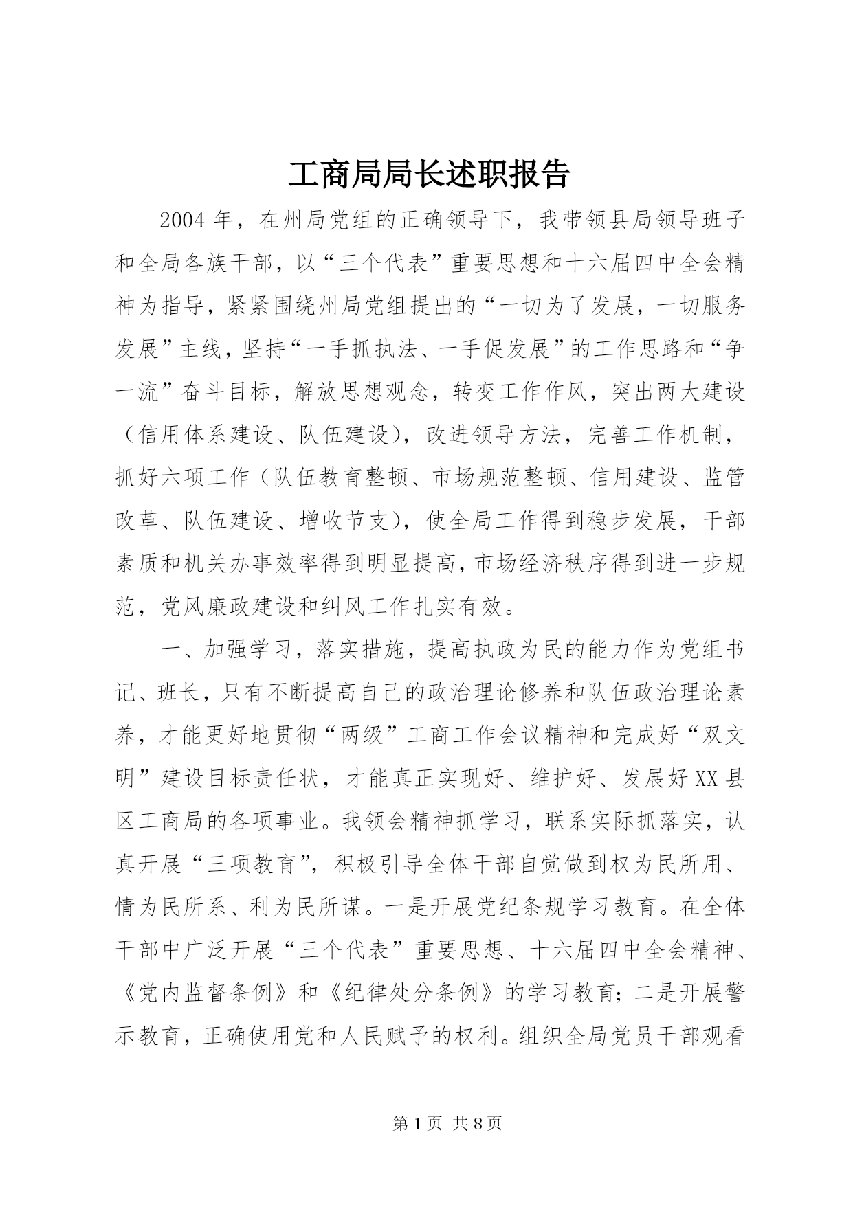 第PAGE\*Arabic\*MERGEFORMAT8页共NUMPAGES\*MERGEFORMAT8页工商局局长述职报告2004年,在州局党组的正确领导下,我带领县局领导班子和全局各族干部,以“三个代表”重要思想和十六届四中全会精神为指导,紧紧围绕州局党组提出的“一切为了发展,一切服务发展”主线,坚持“一手抓执法、一手促发展”的工作思路和“争一流”奋斗目标,解放思想观念,转变工作作风,突出两大建设(信用体系建设、队伍建设),改进领导方法,完善工作机制,抓好六项工作(队伍教育整顿、市场规范整顿