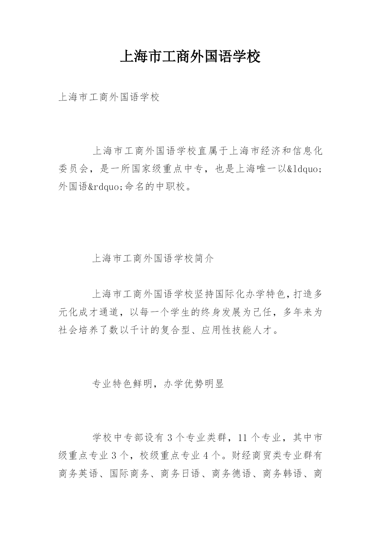 上海市工商外国语学校上海市工商外国语学校上海市工商外国语学校直属于上海市经济和信息化委员会,是一所国家级重点中专,也是上海唯一以“外国语”命名的中职校。上海市工商外国语学校简介上海市工商外国语学校坚持国际化办学特色,打造多元化成才通道,以每一个学生的终身发展为己任,多年来为社会培养了数以千计的复合型、应用性技能人才。专业特色鲜明,办学优势明显学校中专部设有3个专业类群,11个专业,其中市级重点专业3个,校级重点专业4个。财经商贸类专业群有商务英语、国际商务、商务日语、商务德语、商务