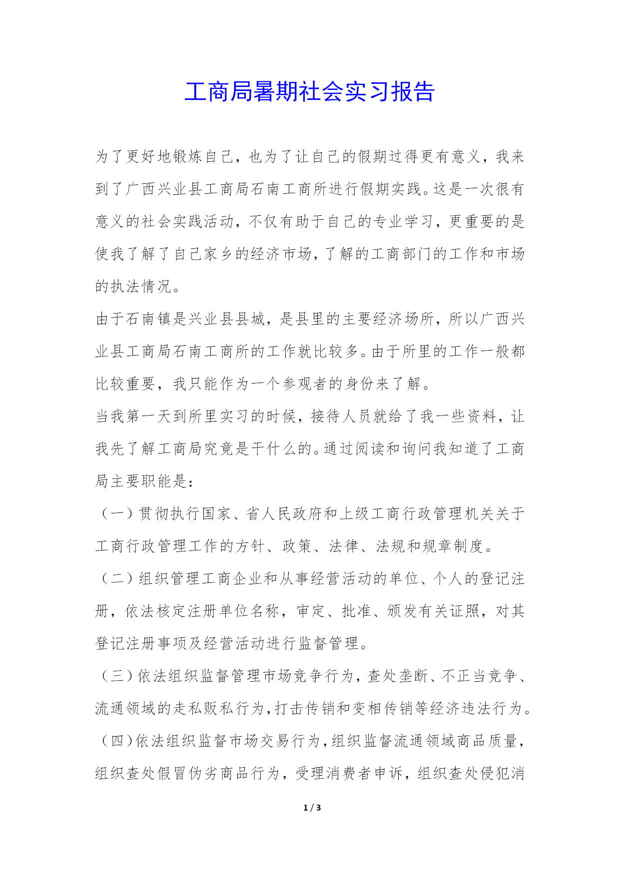 PAGE3/NUMPAGES3工商局暑期社会实习报告为了更好地锻炼自己,也为了让自己的假期过得更有意义,我来到了广西兴业县工商局石南工商所进行假期实践。这是一次很有意义的社会实践活动,不仅有助于自己的专业学习,更重要的是使我了解了自己家乡的经济市场,了解的工商部门的工作和市场的执法情况。由于石南镇是兴业县县城,是县里的主要经济场所,所以广西兴业县工商局石南工商所的工作就比较多。由于所里的工作一般都比较重要,我只能作为一个参观者的身份来了解。当我第一天到所里实习的时候,接待人员就给了我一些资料,