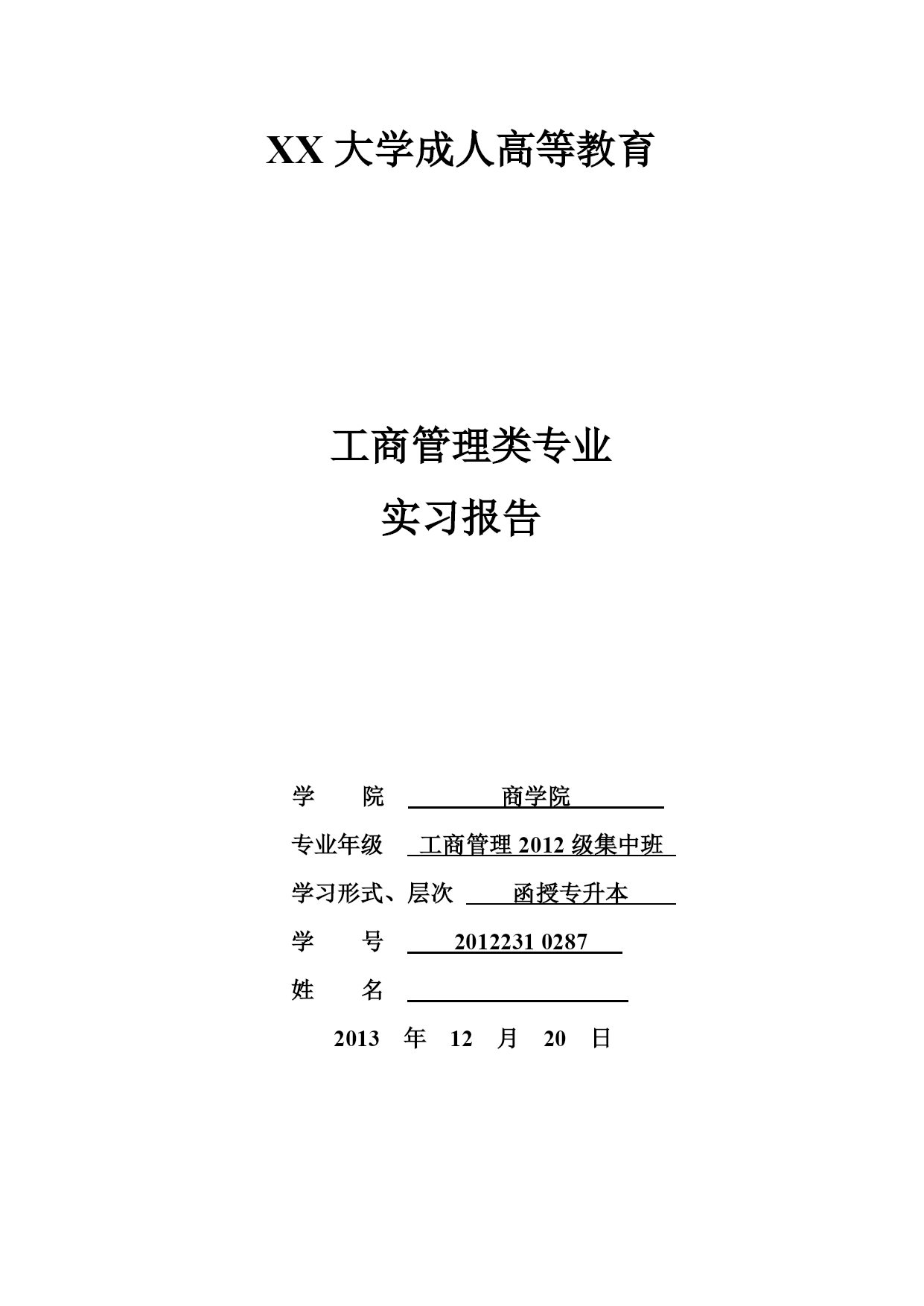 PAGEPAGE8XX大学成人高等教育工商管理类专业实习报告学院商学院专业年级工商管理2012级集中班学习形式、层次函授专升本学号20122310287姓名2013年12月20日一、实习目的毕业实习是每个学生必须拥有的一段经历,它使我们在实践中了解社会,让我们学到了很多在课堂上根本就学不到的知识,受益匪浅,也打开了视野,增长了见识,使我认识到将所学的知识具体应用到工作中去,就会为我们以后进一步走向社会打下坚实的基础,只有在实习期间尽快调整好自己的学习方式,适应社会,才能被这个社会所接纳,进而生