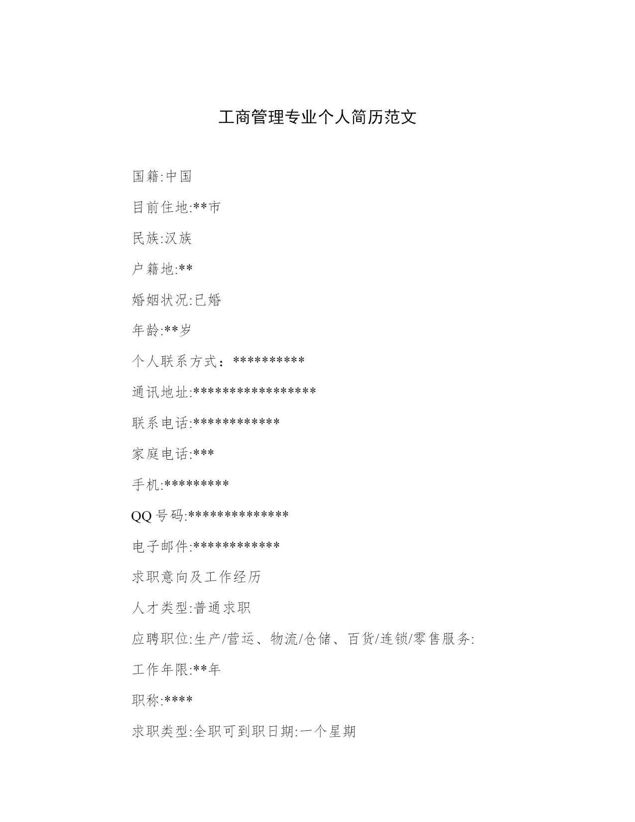 工商管理专业个人简历范文国籍:中国目前住地:**市民族:汉族户籍地:**婚姻状况:已婚年龄:**岁个人联系方式:**********通讯地址:*****************联系电话:************家庭电话:***手机:*********QQ号码:**************电子邮件:************求职意向及工作经历人才类型:普通求职应聘职位:生产/营运、物流/仓储、百货/连锁/零售服务:工作年限:**年职称:****求职类型:全职可到职日期:一个星期月薪要求:****元希望工作地区