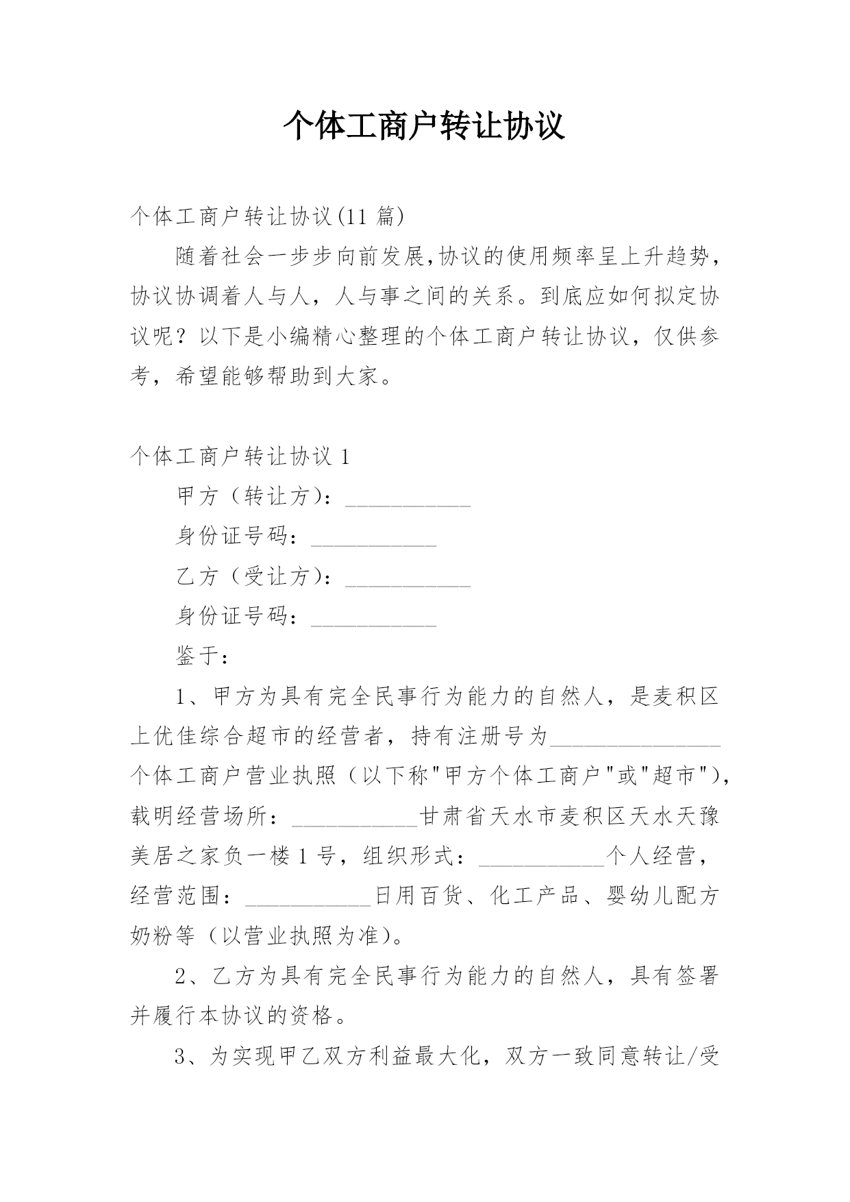 个体工商户转让协议个体工商户转让协议(11篇)随着社会一步步向前发展,协议的使用频率呈上升趋势,协议协调着人与人,人与事之间的关系。到底应如何拟定协议呢?以下是小编精心整理的个体工商户转让协议,仅供参考,希望能够帮助到大家。个体工商户转让协议1甲方(转让方):___________身份证号码:___________乙方(受让方):___________身份证号码:___________鉴于:1、甲方为具有完全民事行为能力的自然人,是麦积区上优佳综合超市的经营者,持有注册号为_______________个