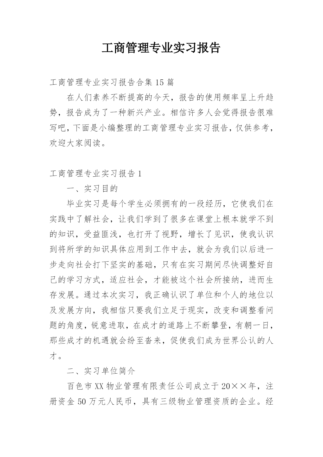 工商管理专业实习报告工商管理专业实习报告合集15篇在人们素养不断提高的今天,报告的使用频率呈上升趋势,报告成为了一种新兴产业。相信许多人会觉得报告很难写吧,下面是小编整理的工商管理专业实习报告,仅供参考,欢迎大家阅读。工商管理专业实习报告1一、实习目的毕业实习是每个学生必须拥有的一段经历,它使我们在实践中了解社会,让我们学到了很多在课堂上根本就学不到的知识,受益匪浅,也打开了视野,增长了见识,使我认识到将所学的知识具体应用到工作中去,就会为我们以后进一步走向社会打下坚实的基础,只有在实习期间尽快调整好自己