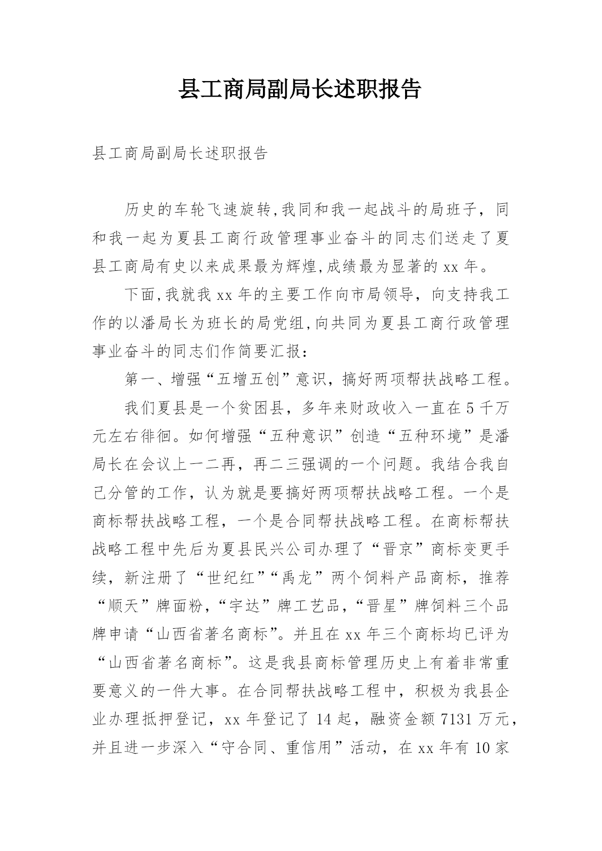 县工商局副局长述职报告县工商局副局长述职报告历史的车轮飞速旋转,我同和我一起战斗的局班子,同和我一起为夏县工商行政管理事业奋斗的同志们送走了夏县工商局有史以来成果最为辉煌,成绩最为显著的xx年。下面,我就我xx年的主要工作向市局领导,向支持我工作的以潘局长为班长的局党组,向共同为夏县工商行政管理事业奋斗的同志们作简要汇报:第一、增强“五增五创”意识,搞好两项帮扶战略工程。我们夏县是一个贫困县,多年来财政收入一直在5千万元左右徘徊。如何增强“五种意识”创造“五种环境”是潘局长在会议上一二再,再二三强调的一个