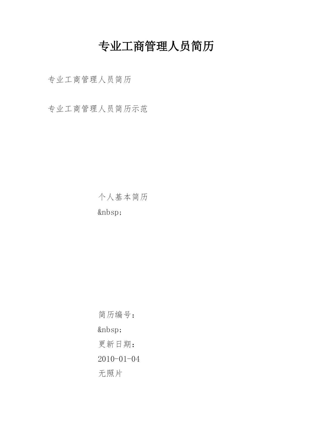 专业工商管理人员简历专业工商管理人员简历专业工商管理人员简历示范个人基本简历 简历编号: 更新日期:2010-01-04无照片姓名: 国籍:中国目前所在地:天津民族:汉族户口所在地:吉林身材:170cm80kg婚姻状况:未婚年龄:34岁培训认证: 诚信徽章: 求职意向及工作经历人才类型:普通求职应聘职位:经营/管理类:企业管理人员、工作年限:11职称:无职称求职类型:全职可到职日期:随时月薪要求:2000--3500希望工作地区:天津个人工作经历:公司名称