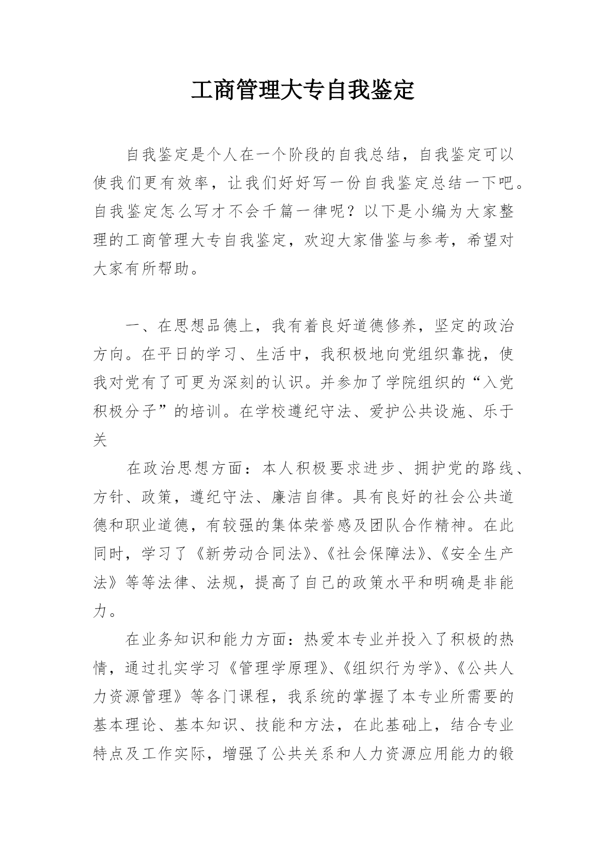 工商管理大专自我鉴定自我鉴定是个人在一个阶段的自我总结,自我鉴定可以使我们更有效率,让我们好好写一份自我鉴定总结一下吧。自我鉴定怎么写才不会千篇一律呢?以下是小编为大家整理的工商管理大专自我鉴定,欢迎大家借鉴与参考,希望对大家有所帮助。一、在思想品德上,我有着良好道德修养,坚定的政治方向。在平日的学习、生活中,我积极地向党组织靠拢,使我对党有了可更为深刻的认识。并参加了学院组织的“入党积极分子”的培训。在学校遵纪守法、爱护公共设施、乐于关在政治思想方面:本人积极要求进步、拥护党的路线、方针、政策,遵纪守法