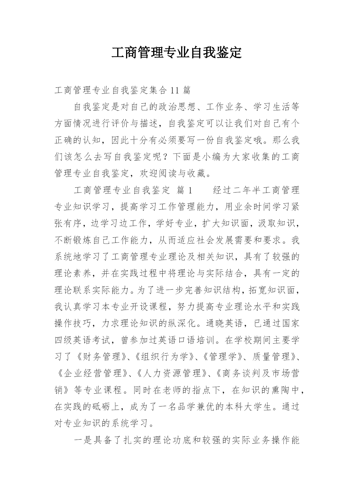 工商管理专业自我鉴定工商管理专业自我鉴定集合11篇自我鉴定是对自己的政治思想、工作业务、学习生活等方面情况进行评价与描述,自我鉴定可以让我们对自己有个正确的认知,因此十分有必须要写一份自我鉴定哦。那么我们该怎么去写自我鉴定呢?下面是小编为大家收集的工商管理专业自我鉴定,欢迎阅读与收藏。工商管理专业自我鉴定篇1经过二年半工商管理专业知识学习,提高学习工作管理能力,用业余时间学习紧张有序,边学习边工作,学好专业,扩大知识面,汲取知识,不断锻炼自己工作能力,从而适应社会发展需要和要求。我系统地学习了工商管理专业