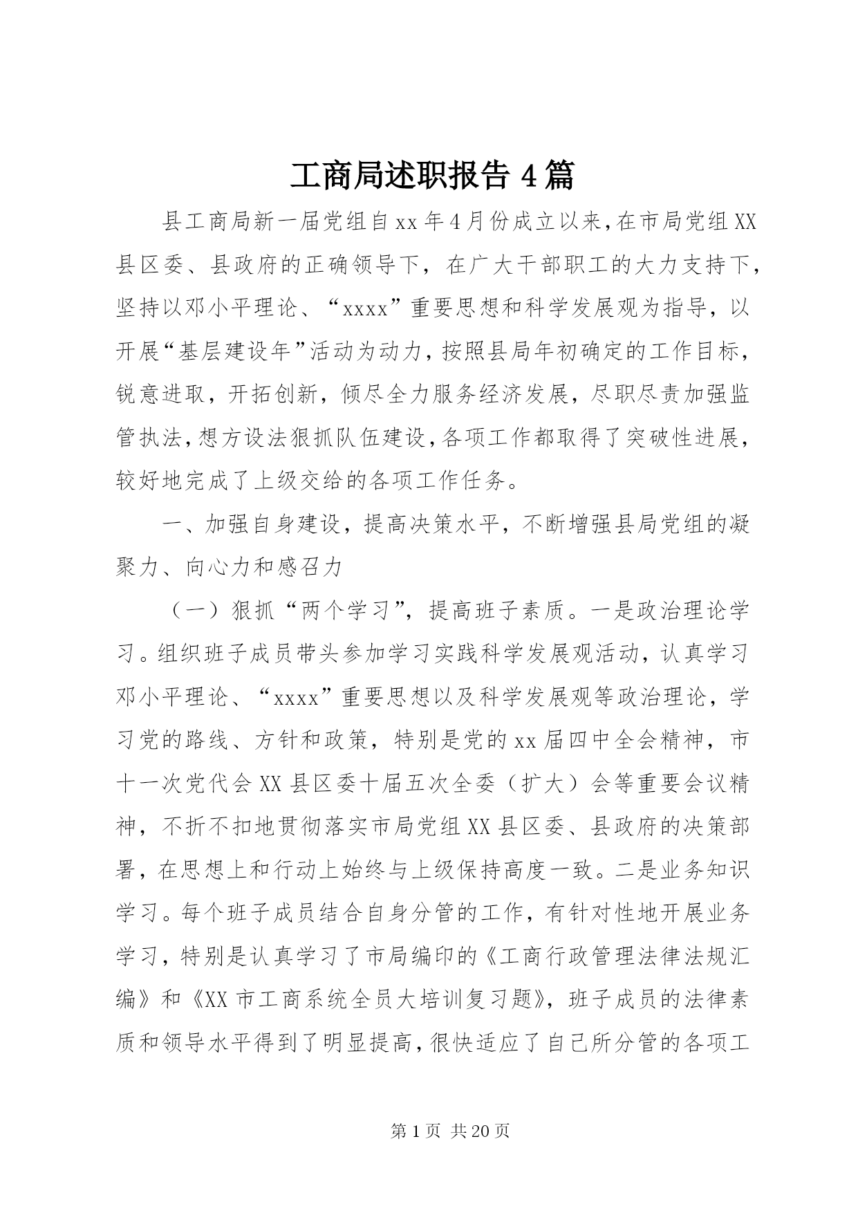 第PAGE\*Arabic\*MERGEFORMAT20页共NUMPAGES\*MERGEFORMAT20页工商局述职报告4篇县工商局新一届党组自xx年4月份成立以来,在市局党组XX县区委、县政府的正确领导下,在广大干部职工的大力支持下,坚持以邓小平理论、“xxxx”重要思想和科学发展观为指导,以开展“基层建设年”活动为动力,按照县局年初确定的工作目标,锐意进取,开拓创新,倾尽全力服务经济发展,尽职尽责加强监管执法,想方设法狠抓队伍建设,各项工作都取得了突破性进展,较好地完成了上级交给的各项工