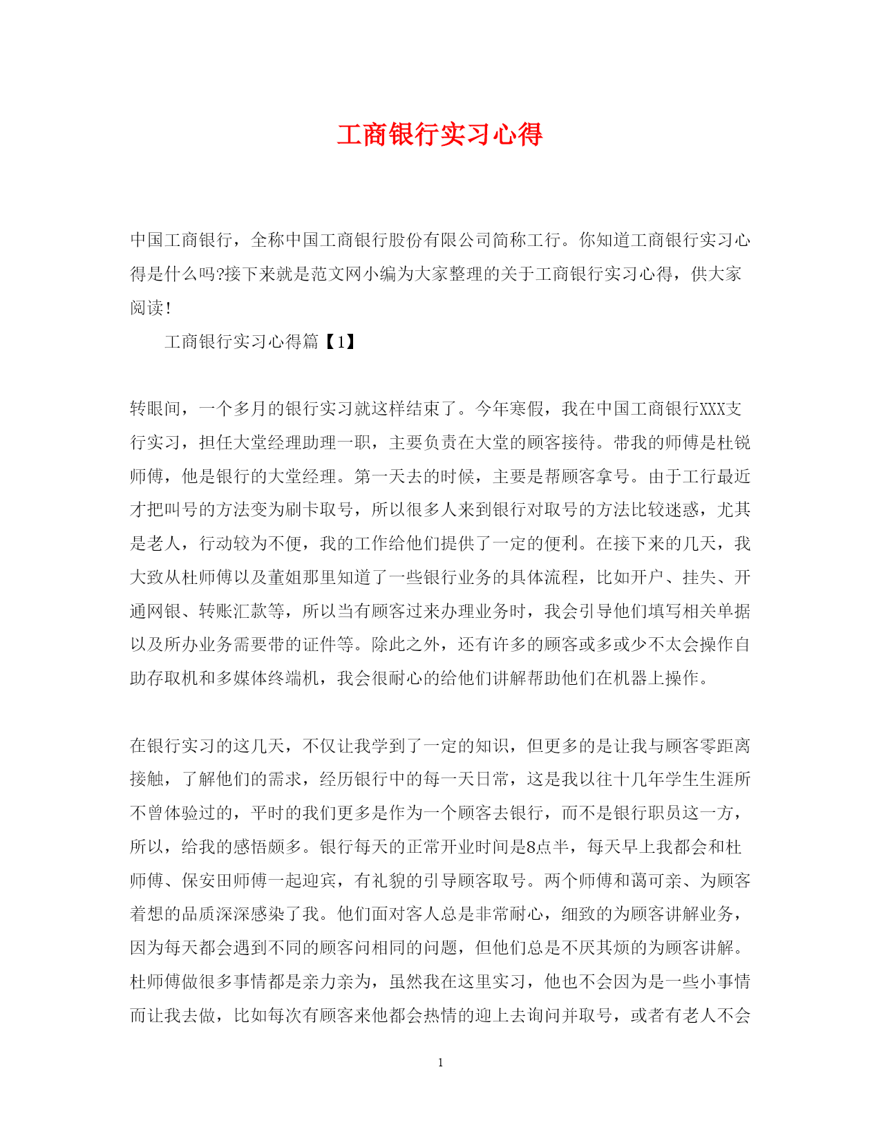 此资料由网络收集而来,如有侵权请告知上传者立即删除。资料共分享,我们负责传递知识。PAGEPAGE8工商银行实习心得中国工商银行,全称中国工商银行股份有限公司简称工行。你知道工商银行实习心得是什么吗?接下来就是范文网小编为大家整理的关于工商银行实习心得,供大家阅读!工商银行实习心得篇【1】转眼间,一个多月的银行实习就这样结束了。今年寒假,我在中国工商银行XXX支行实习,担任大堂经理助理一职,主要负责在大堂的顾客接待。带我的师傅是杜锐师傅,他是银行的大堂经理。第一天去的时候,主要是帮顾客拿号。由