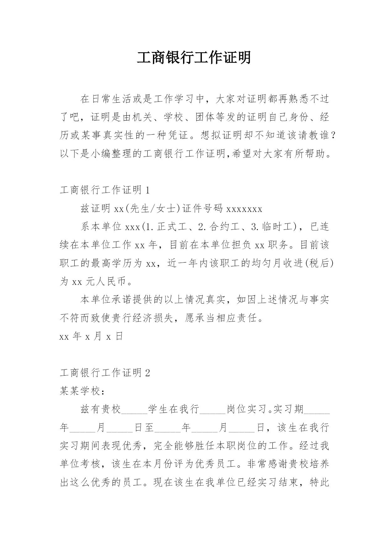 工商银行工作证明在日常生活或是工作学习中,大家对证明都再熟悉不过了吧,证明是由机关、学校、团体等发的证明自己身份、经历或某事真实性的一种凭证。想拟证明却不知道该请教谁?以下是小编整理的工商银行工作证明,希望对大家有所帮助。工商银行工作证明1兹证明xx(先生/女士)证件号码xxxxxxx系本单位xxx(1.正式工、2.合约工、3.临时工),已连续在本单位工作xx年,目前在本单位担负xx职务。目前该职工的最高学历为xx,近一年内该职工的均匀月收进(税后)为xx元人民币。本单位承诺提供的以上情况真实,如因上述情