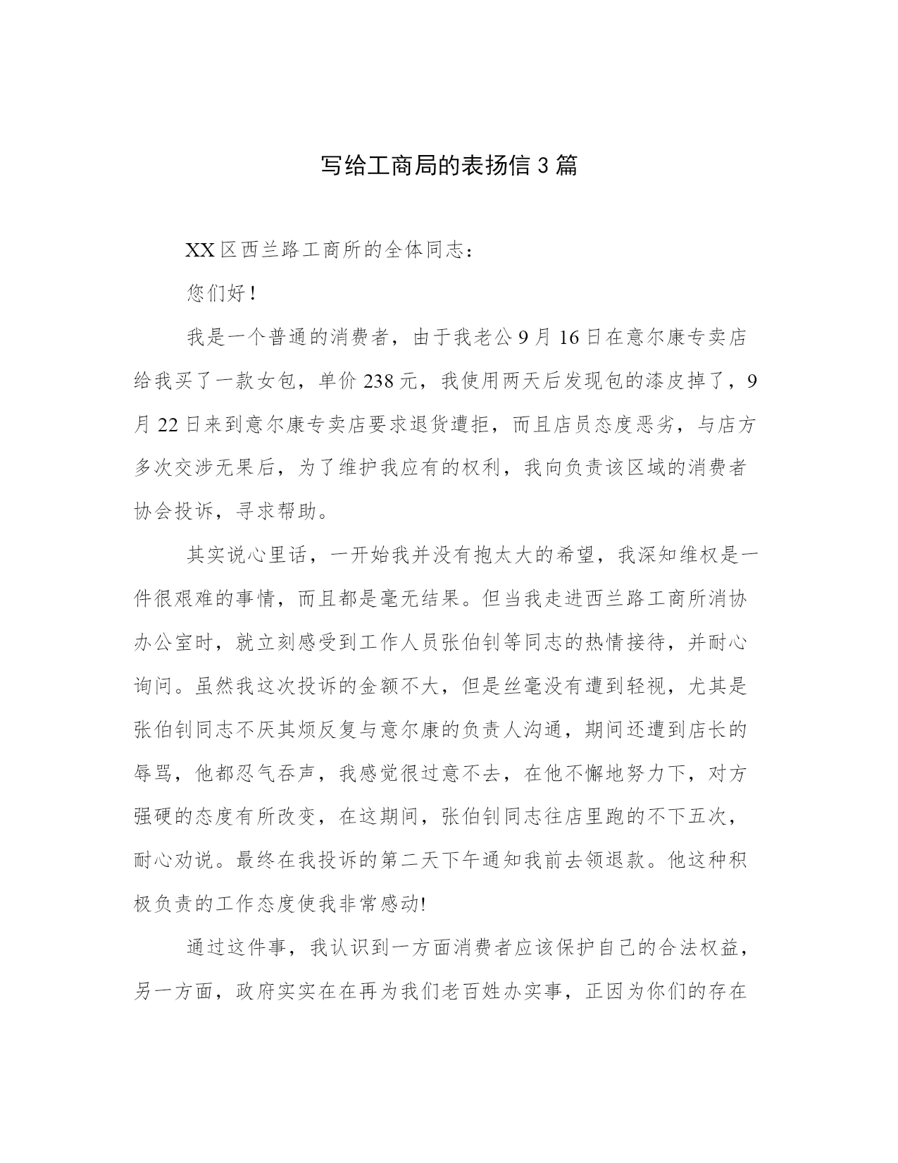 写给工商局的表扬信3篇XX区西兰路工商所的全体同志:您们好!我是一个普通的消费者,由于我老公9月16日在意尔康专卖店给我买了一款女包,单价238元,我使用两天后发现包的漆皮掉了,9月22日来到意尔康专卖店要求退货遭拒,而且店员态度恶劣,与店方多次交涉无果后,为了维护我应有的权利,我向负责该区域的消费者协会投诉,寻求帮助。其实说心里话,一开始我并没有抱太大的希望,我深知维权是一件很艰难的事情,而且都是毫无结果。但当我走进西兰路工商所消协办公室时,就立刻感受到工作人员张伯钊等同志的热情接待,并耐心询问。虽然我