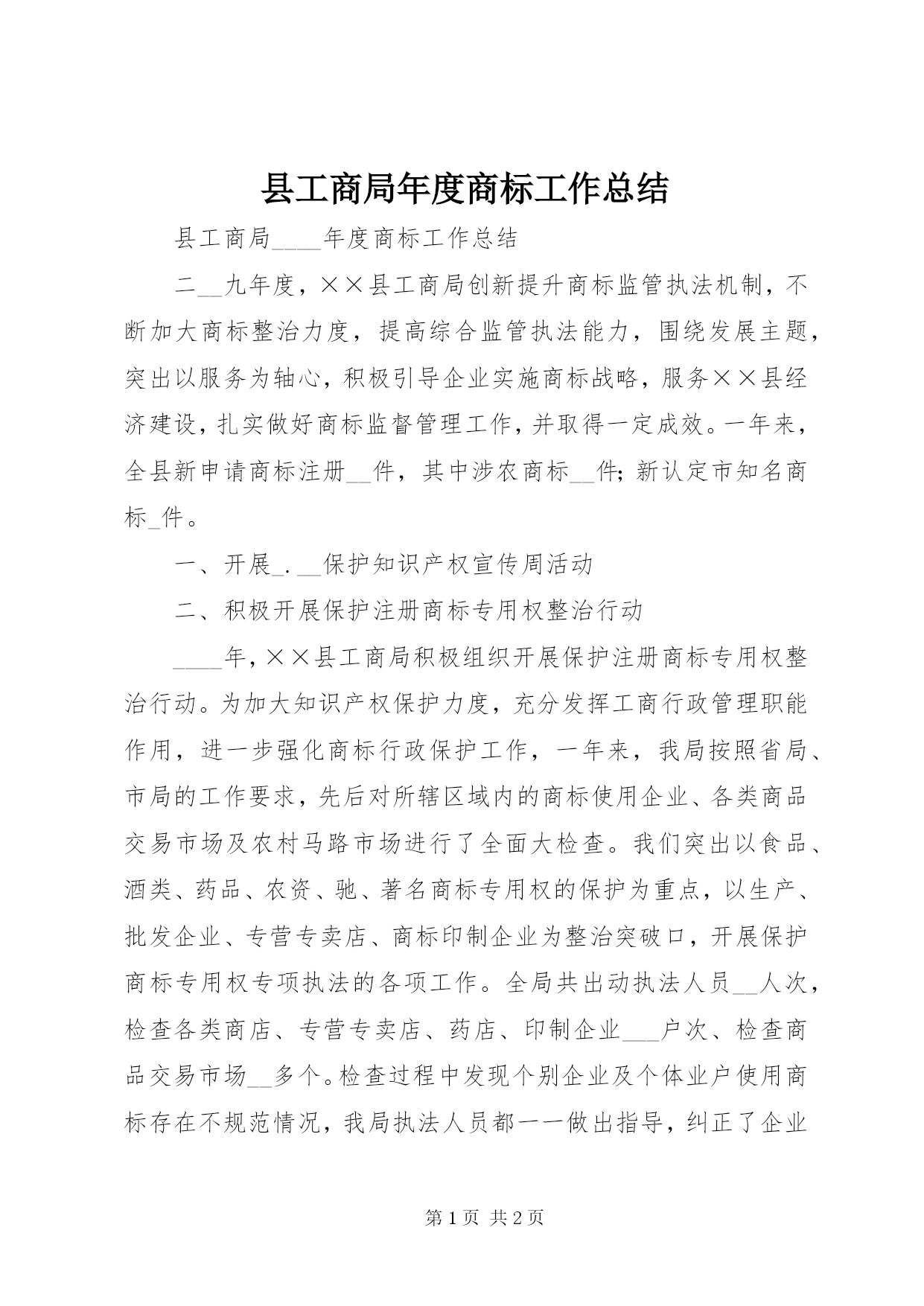 第PAGE\*Arabic\*MERGEFORMAT2页共NUMPAGES\*MERGEFORMAT2页县工商局年度商标工作总结县工商局____年度商标工作总结二__九年度,××县工商局创新提升商标监管执法机制,不断加大商标整治力度,提高综合监管执法能力,围绕发展主题,突出以服务为轴心,积极引导企业实施商标战略,服务××县经济建设,扎实做好商标监督管理工作,并取得一定成效。一年来,全县新申请商标注册__件,其中涉农商标__件;新认定市知名商标_件。一、开展_.__保护知识产权宣传周活动二、积极