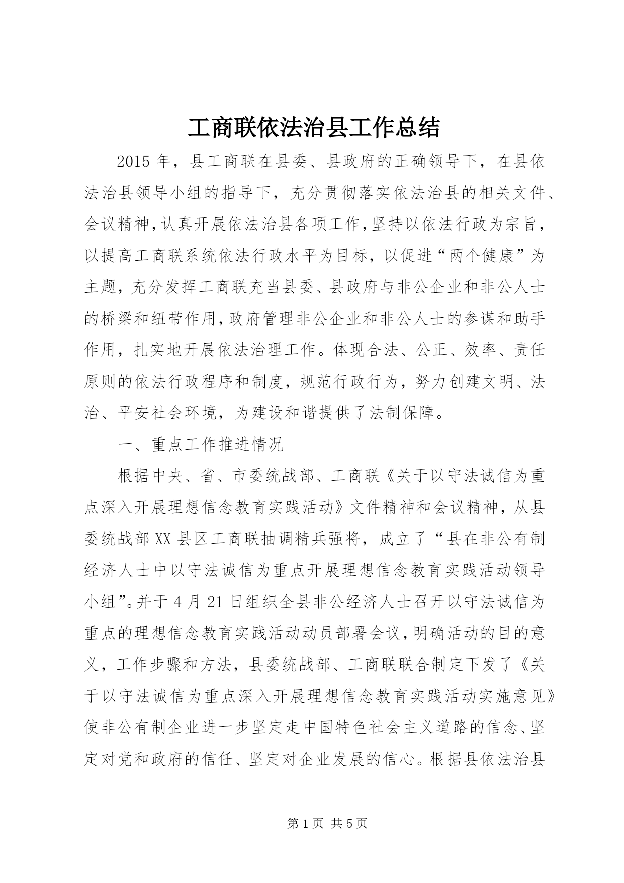 第PAGE\*Arabic\*MERGEFORMAT5页共NUMPAGES\*MERGEFORMAT5页工商联依法治县工作总结2015年,县工商联在县委、县政府的正确领导下,在县依法治县领导小组的指导下,充分贯彻落实依法治县的相关文件、会议精神,认真开展依法治县各项工作,坚持以依法行政为宗旨,以提高工商联系统依法行政水平为目标,以促进“两个健康”为主题,充分发挥工商联充当县委、县政府与非公企业和非公人士的桥梁和纽带作用,政府管理非公企业和非公人士的参谋和助手作用,扎实地开展依法治理工作。体现合