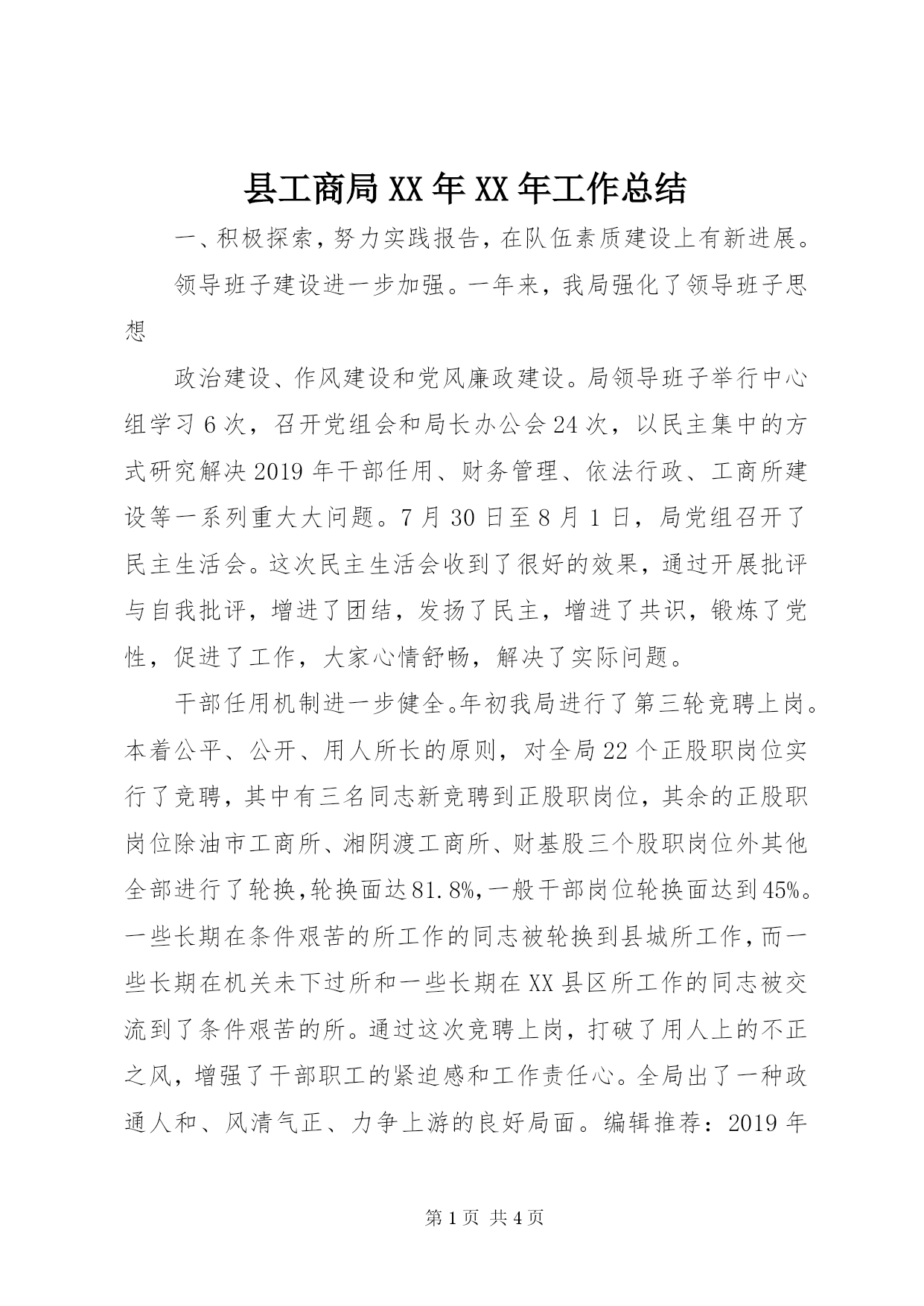 第PAGE\*Arabic\*MERGEFORMAT4页共NUMPAGES\*MERGEFORMAT4页县工商局XX年XX年工作总结一、积极探索,努力实践报告,在队伍素质建设上有新进展。领导班子建设进一步加强。一年来,我局强化了领导班子思想政治建设、作风建设和党风廉政建设。局领导班子举行中心组学习6次,召开党组会和局长办公会24次,以民主集中的方式研究解决2019年干部任用、财务管理、依法行政、工商所建设等一系列重大大问题。7月30日至8月1日,局党组召开了民主生活会。这次民主生活会收到了很好