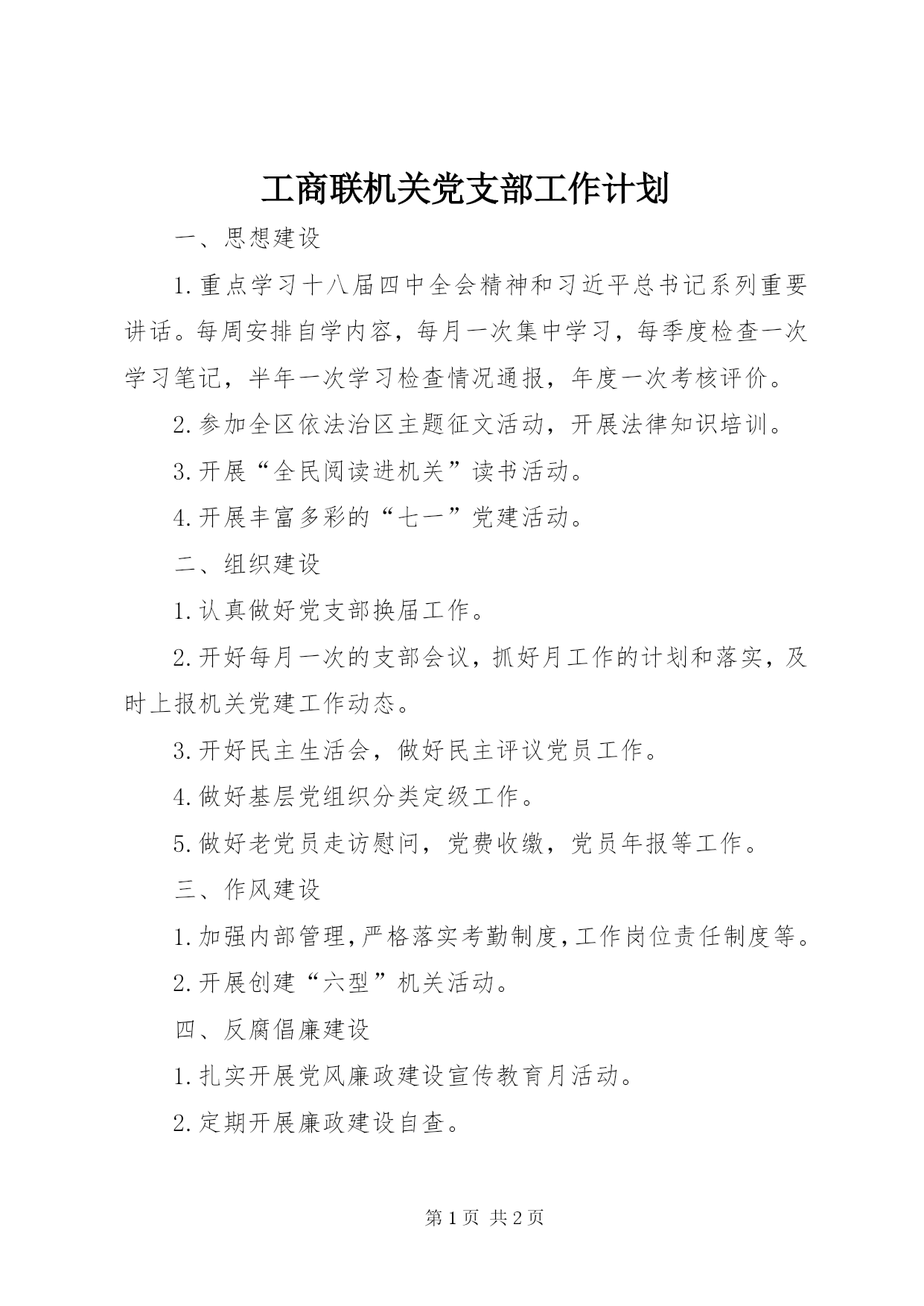 第PAGE\*Arabic\*MERGEFORMAT2页共NUMPAGES\*MERGEFORMAT2页工商联机关党支部工作计划一、思想建设1.重点学习十八届四中全会精神和习近平总书记系列重要讲话。每周安排自学内容,每月一次集中学习,每季度检查一次学习笔记,半年一次学习检查情况通报,年度一次考核评价。2.参加全区依法治区主题征文活动,开展法律知识培训。3.开展“全民阅读进机关”读书活动。4.开展丰富多彩的“七一”党建活动。二、组织建设1.认真做好党支部换届工作。2.开好每月一次的支部会议,抓好