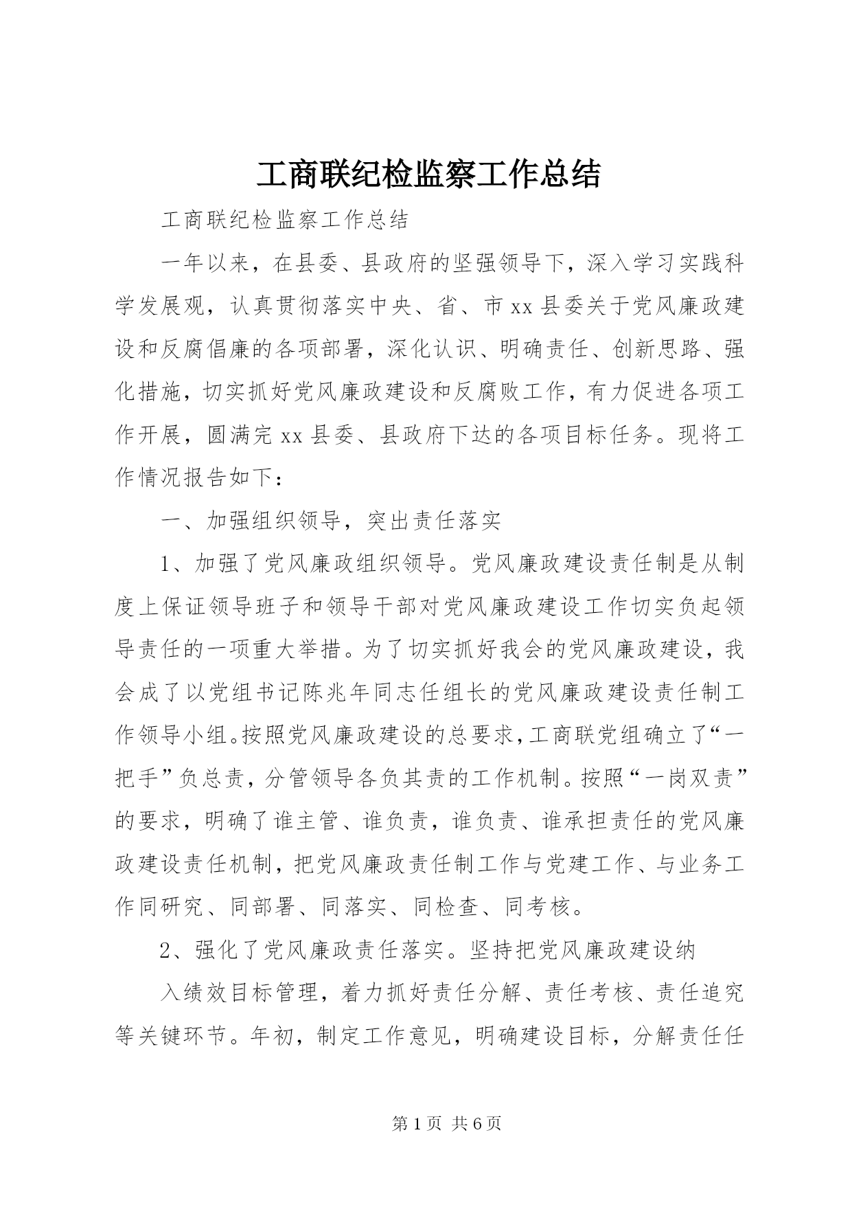 第PAGE\*Arabic\*MERGEFORMAT6页共NUMPAGES\*MERGEFORMAT6页工商联纪检监察工作总结工商联纪检监察工作总结一年以来,在县委、县政府的坚强领导下,深入学习实践科学发展观,认真贯彻落实中央、省、市xx县委关于党风廉政建设和反腐倡廉的各项部署,深化认识、明确责任、创新思路、强化措施,切实抓好党风廉政建设和反腐败工作,有力促进各项工作开展,圆满完xx县委、县政府下达的各项目标任务。现将工作情况报告如下:一、加强组织领导,突出责任落实1、加强了党风廉政组织领导。
