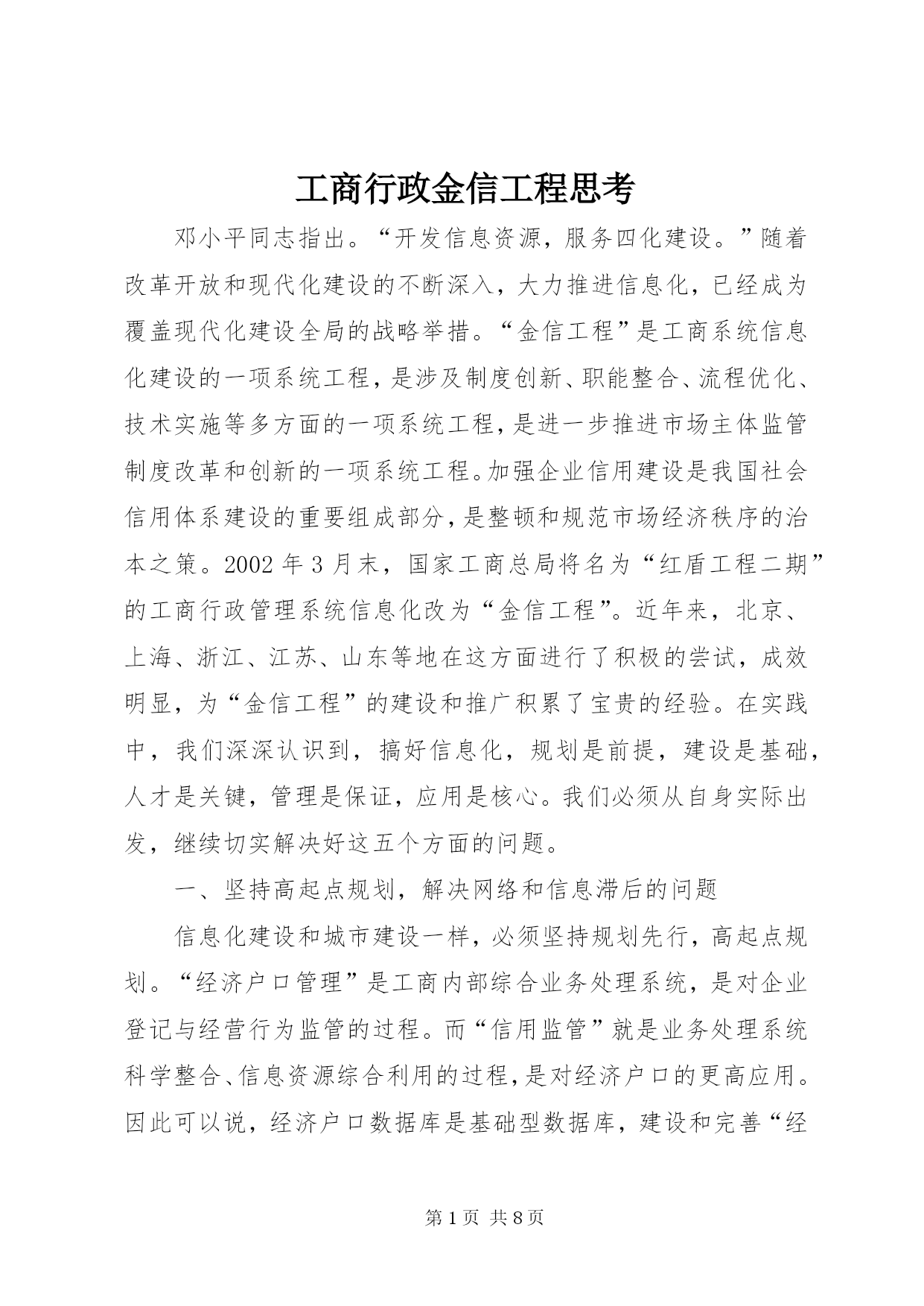 第PAGE\*Arabic\*MERGEFORMAT8页共NUMPAGES\*MERGEFORMAT8页工商行政金信工程思考邓小平同志指出。“开发信息资源,服务四化建设。”随着改革开放和现代化建设的不断深入,大力推进信息化,已经成为覆盖现代化建设全局的战略举措。“金信工程”是工商系统信息化建设的一项系统工程,是涉及制度创新、职能整合、流程优化、技术实施等多方面的一项系统工程,是进一步推进市场主体监管制度改革和创新的一项系统工程。加强企业信用建设是我国社会信用体系建设的重要组成部分,是整顿和规范